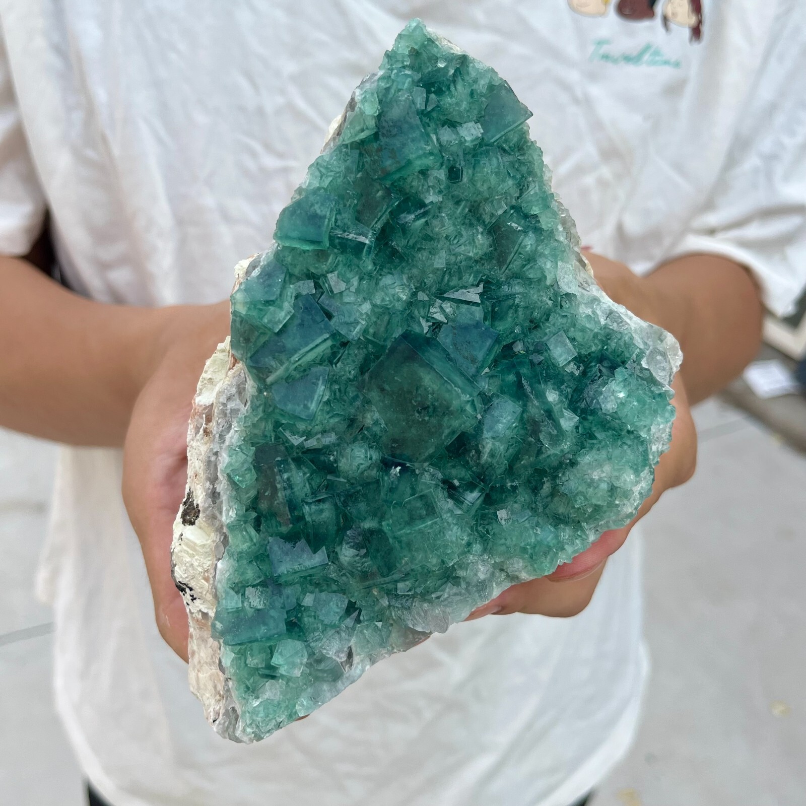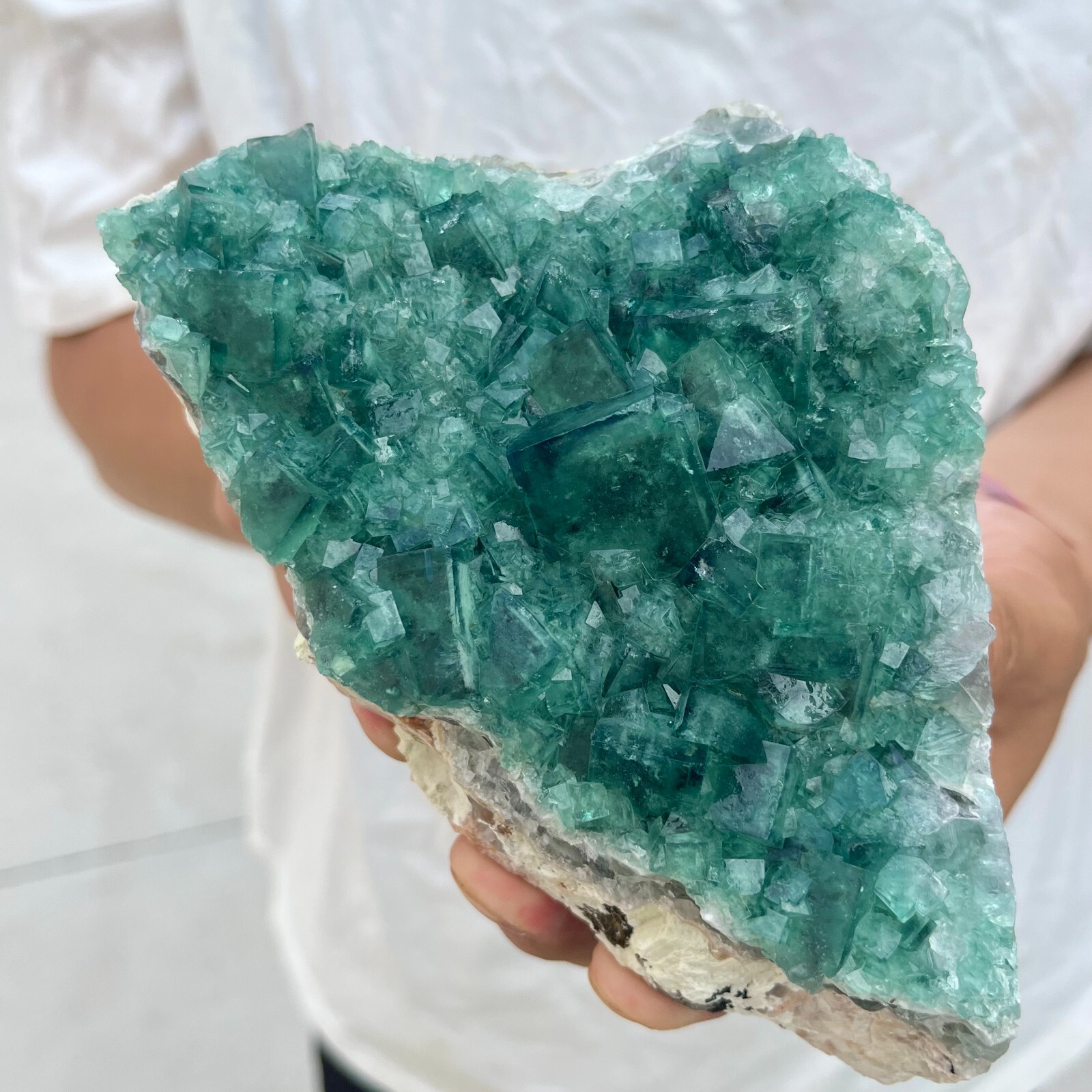 This stunning fluorite quartz cluster is absolutely mesmerizing! The vibrant green cubes have such a rich, natural depth of color, and the way they catch the light is breathtaking. At nearly 2lbs, it's a substantial piece with beautiful layering and texture. The seller's photos accurately show the details, though remember it's hand-held for scale. Perfect for collectors or crystal lovers—it feels even better in person than in pictures! Arrived safely packed and looks just as gorgeous as described. A truly unique find!