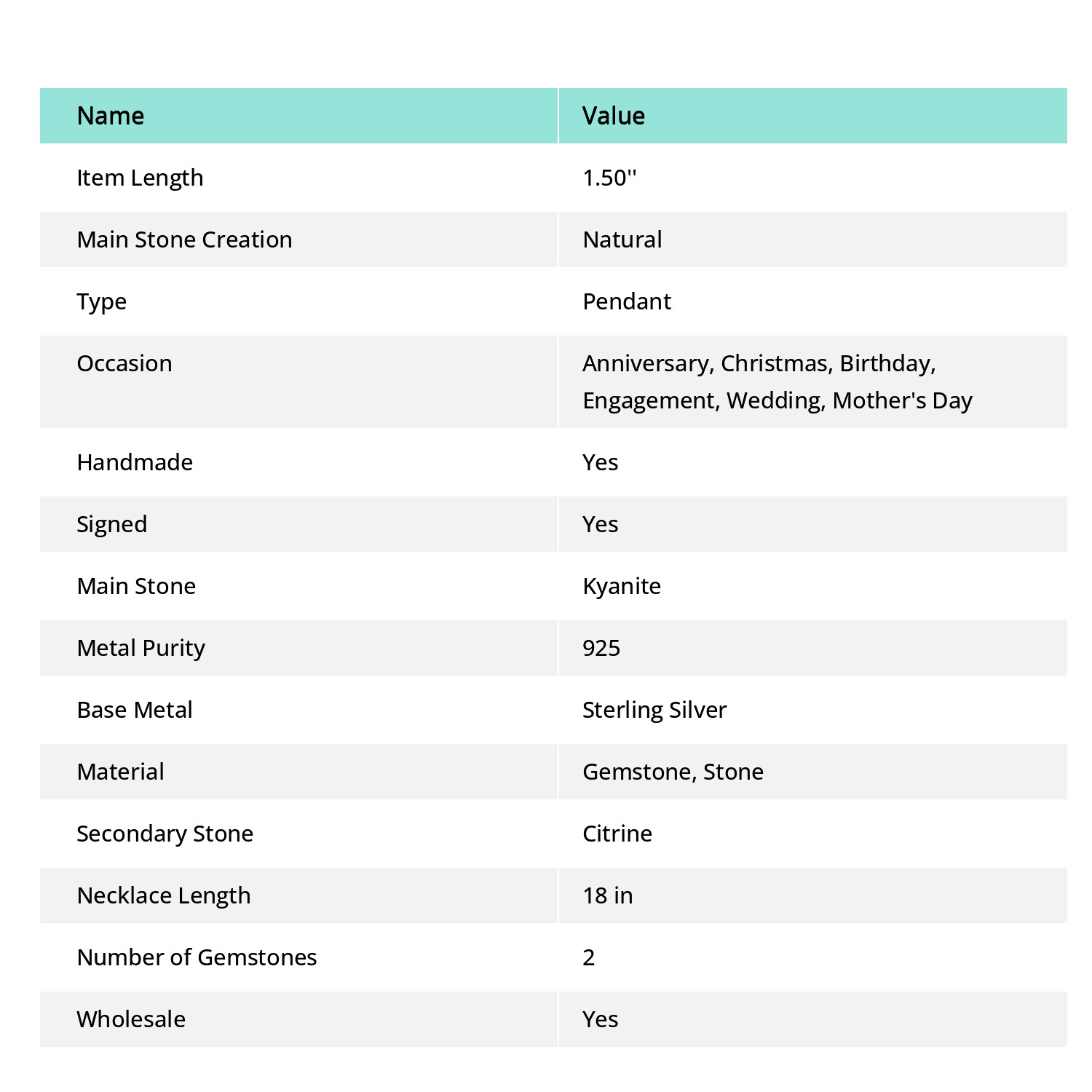 Style: Cluster Diamond Color Grade: Not Applicable Occasion: Anniversary, Christmas, Birthday, Engagement, Wedding, Mother's Day Pendant/Locket Type: Charm UPC: does not apply Color: Blue Secondary Stone: Citrine Type: Pendant Collection: Brand New Main Stone Treatment: Not Enhanced Era: Undated Certification: Yes Handmade: Yes Item Length: 1.50'' Cut Grade: Fair Closure: Toggle Colored Diamond Intensity: Not Applicable Total Carat Weight: 50 Carat Above Pendant Shape: Same As Picture Necklace Length: 18 in Material: Gemstone, Stone Setting Style: Channel-Set Base Metal: Sterling Silver Theme: Art, Beach, Family & Friends Wholesale: Yes Number of Diamonds: 0 Metal: Sterling Silver Features: Adjustable, Engraved Metal Purity: 925 Brand: Unbranded Country/Region of Manufacture: India Customized: No Diamond Clarity Grade: Not Applicable Number of Gemstones: 2 Country of Origin: India Main Stone Shape: Same As Picture Weight: 3.3 gm Main Stone: Kyanite Main Stone Creation: Natural Chain Type: Rolo Signed: Yes ProductName: Pendant gtin13: does not apply Main Stone Color: Blue Gemstone Clarity Grade: Eye Clean