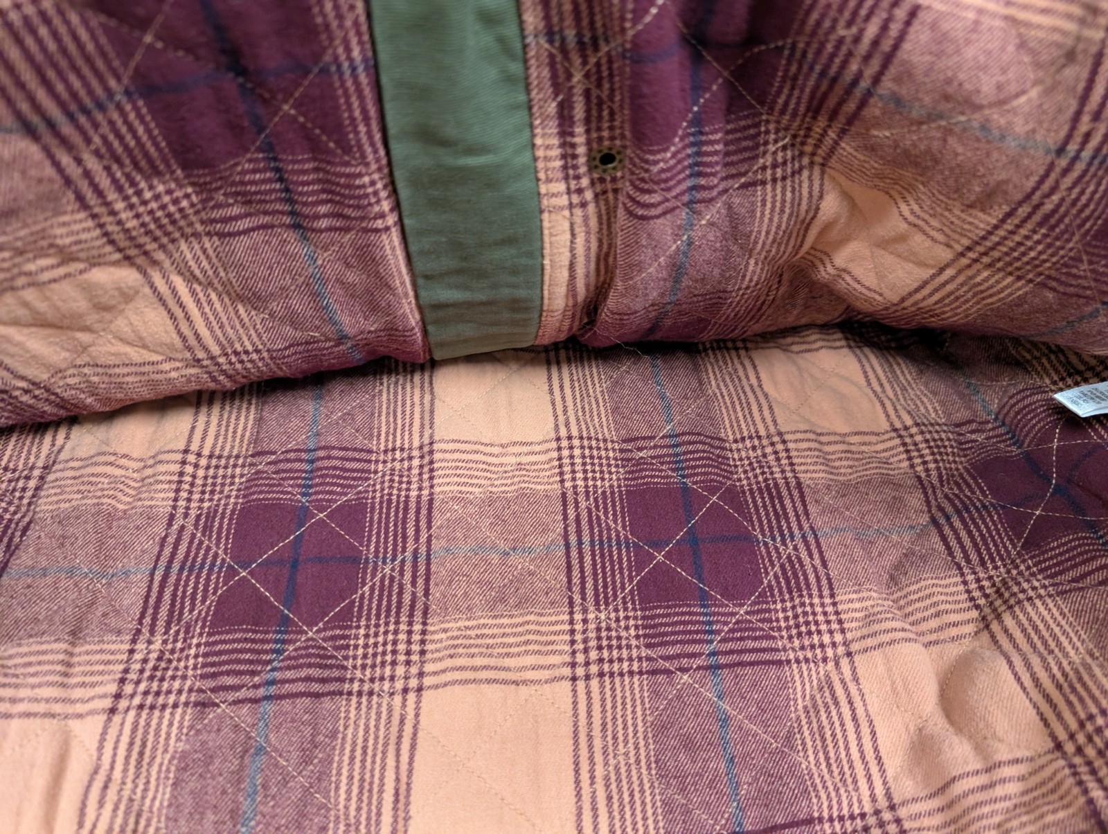 Shell and body lining: 100% cotton Sleeve lining and fill: 100% polyester Durable shell with supersoft lining Snap-button-concealed zip-close front Open chest pockets Hand pockets Snap-button cuffs Pop-up collar