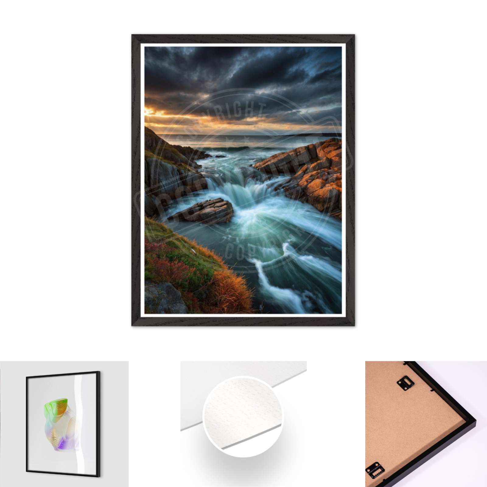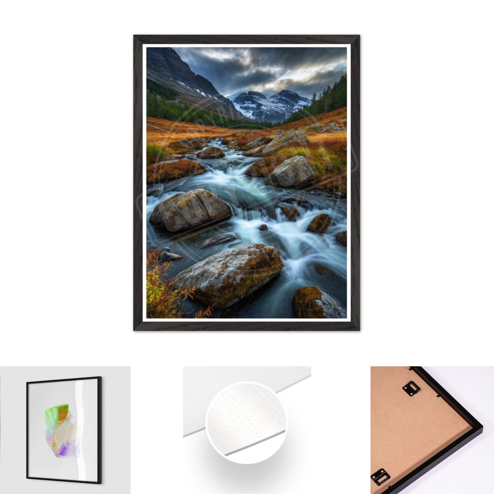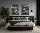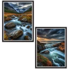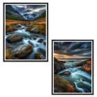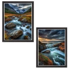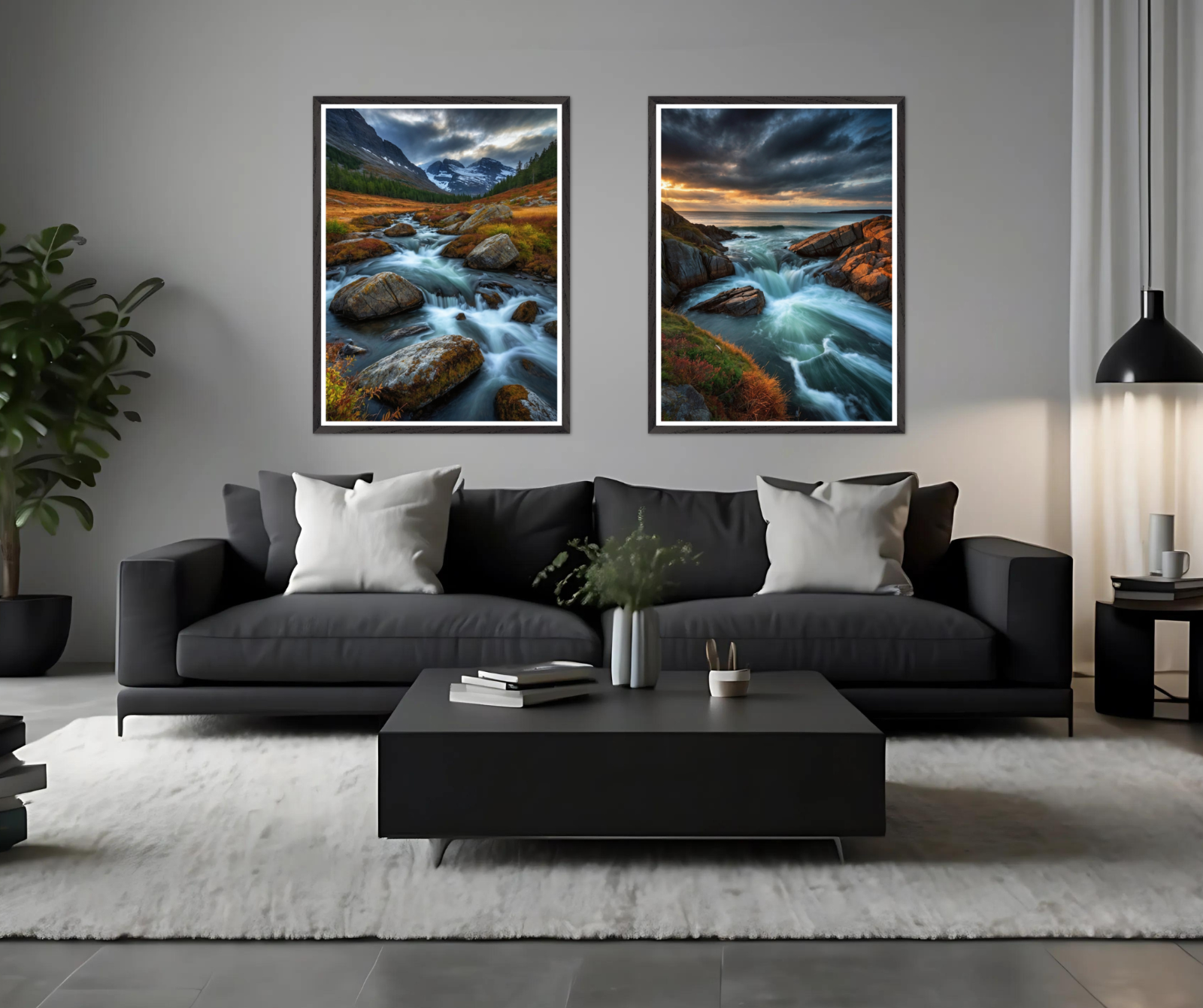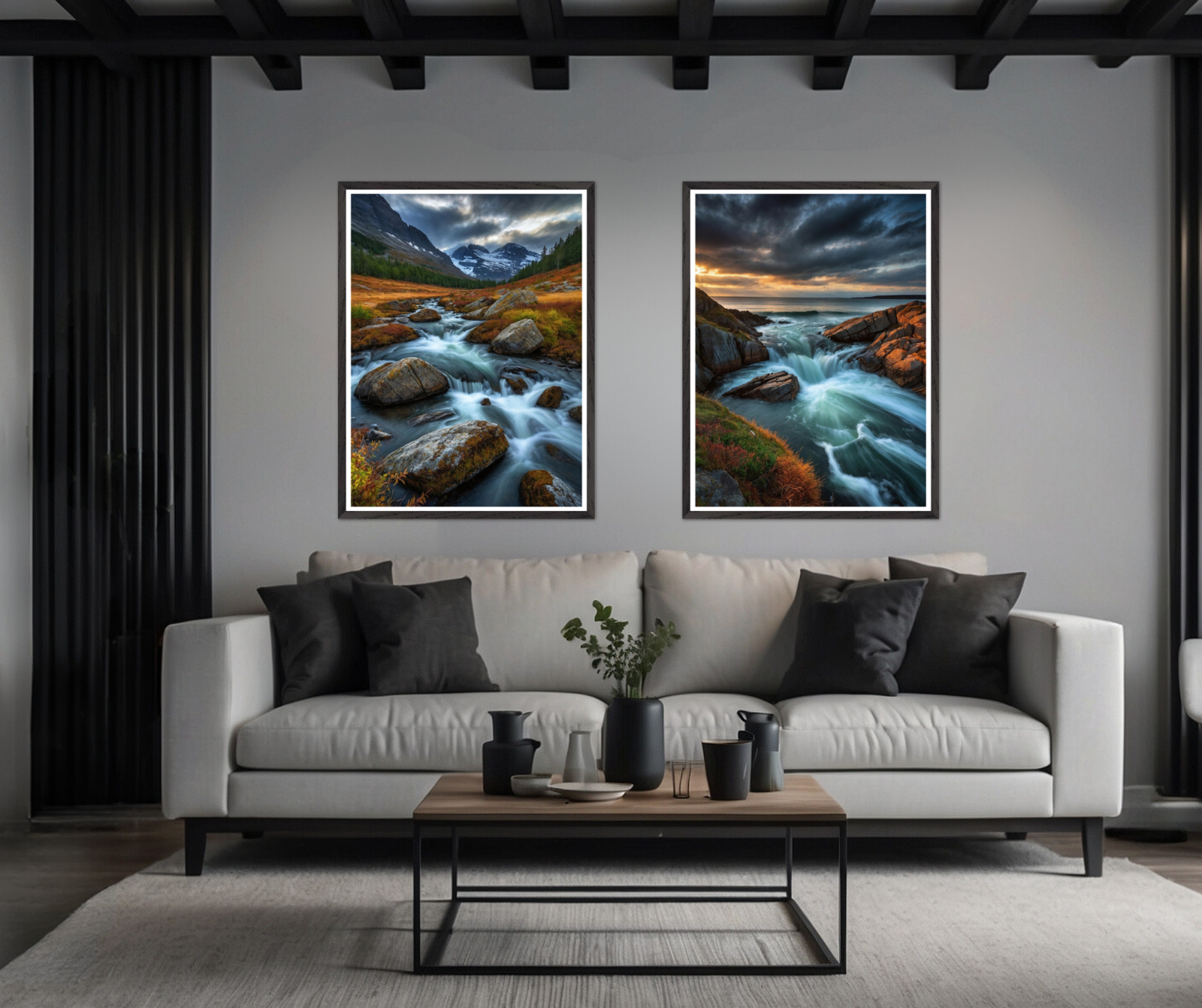 Capture the breathtaking beauty of nature with this HDR photographic Scandinavian landscape 2-piece set , featuring two stunning images that highlight the majesty of water in motion. The first image showcases a rugged mountain landscape , with a river cutting through the dramatic terrain, while the second image presents a serene coastal seascape , where sea water rushes down a creek towards the ocean. Both pieces share a common theme of moving water, offering a harmonious blend of rugged natural beauty and tranquil serenity. Expertly printed on premium semi-gloss photo paper , each photograph boasts over 400dpi resolution, ensuring incredibly crisp details and rich, vibrant earth tone colors . The semi-gloss finish enhances the depth of the images, bringing out the stunning contrasts between water, land, and sky. Encased in sleek black pine wood frames , this set adds a refined and modern touch to any space. Perfect for nature lovers, these ready-to-hang framed prints will elevate your home or office with their awe-inspiring Scandinavian charm. Description Our premium wooden framed posters, ready to hang, feature responsibly sourced oak or ash frames with unique wood grain for a classic or modern touch. Printed on semi-glossy paper, they offer vibrant colors and protection from light and moisture: Ready-to-hang: Includes hanging kit, ready to hang directly on the wall. Frame Material: Responsibly sourced oak and ash wood. Frame Color: black showcasing the distinct wood grain. Frame Measurements: 20mm (0.79") thick and wide, wider than the classic 14mm (0.55") frame. Paper Weight: 200 gsm (80 lb), thickness: 0.22 mm (8.7 mils), durable and long-lasting. Paper Finishing: Semi-glossy, enhances colors with a subtle shine. Protection: Shatterproof plexiglass protects the print. Sustainable Paper: FSC-certified materials or equivalent. Available Sizes: 12x16, 18x24 and 24x32 Packaging The prints are placed within frames upon arrival. The frames come pre-packed with corners and wrap and then packed in a box with strong edges to protect the frames. I-beams are used in addition, to give the package additional sturdiness and delivered safely to your doorstep. If there are any problems with your order, don't hesitate to contact us and we will do whatever is necessary to fix that issue for we value your business. * Shipping to Alaska, Hawaii, and unincorporated territories of the United States can take additional 7 ? 12 business days, weather permitting.
