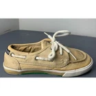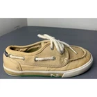 These Nautica boat shoes offer a classic design with durable canvas material and a comfortable fit. Ideal for casual outings, these lace-up shoes are designed to provide both style and functionality for young adventurers. • Lace-up closure • Canvas upper material • Rubber outsole • Nautica branding • Cushioned insole Visible signs of wear on the canvas and slight scuffing on the soles.