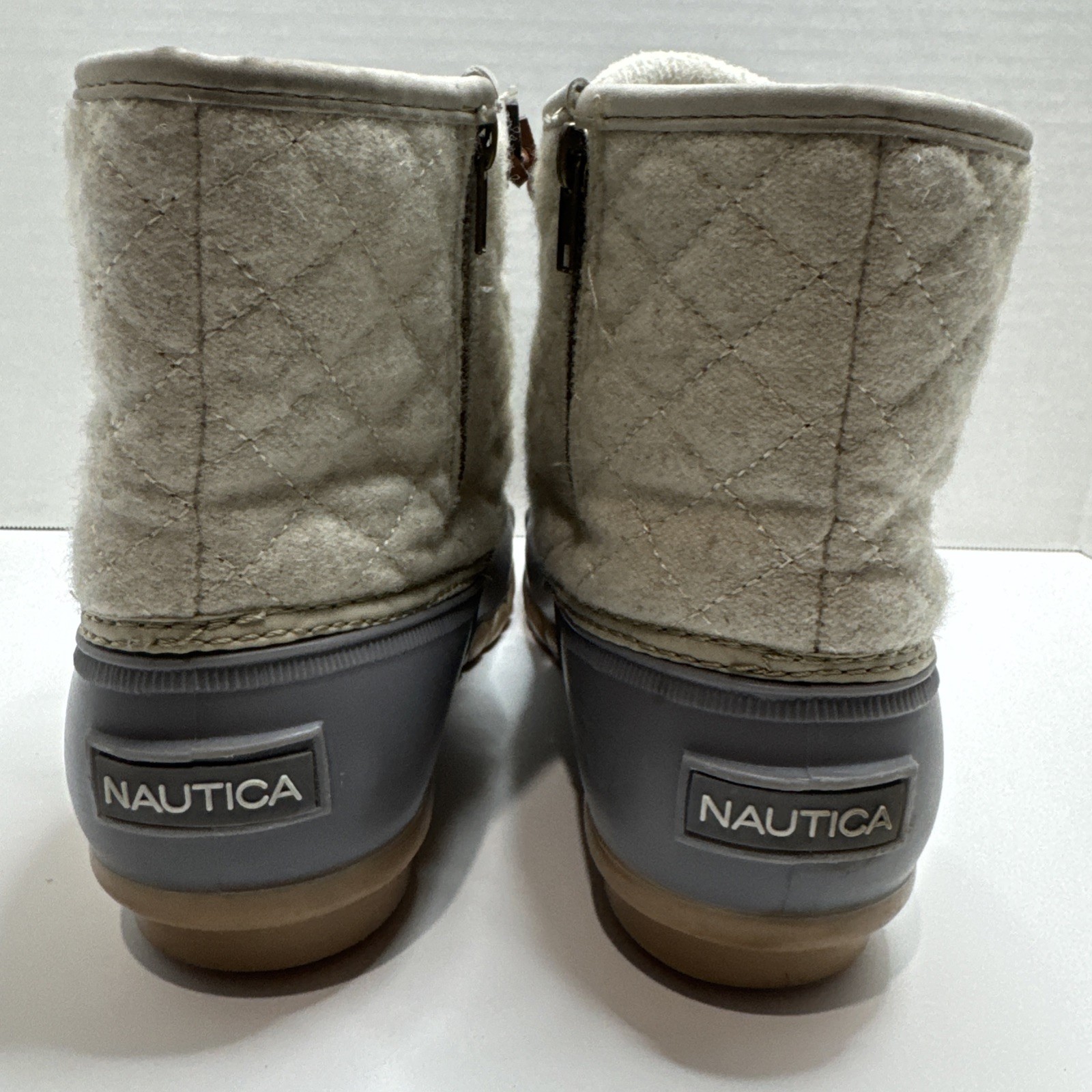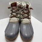 The NWT Nautica WOOLEY Duck Boots in Cream & Gray are stylish and practical for the winter season. These boots feature a round toe shape, leather laces, and a lined interior for warmth. The solid gray color and duck theme add a fun touch to the design. With a platform height of 1 inch, these boots are sure to keep your feet comfortable and dry in snowy or rainy weather. Made with man-made materials, these size 11 boots are perfect for women looking for a cozy and durable footwear option.