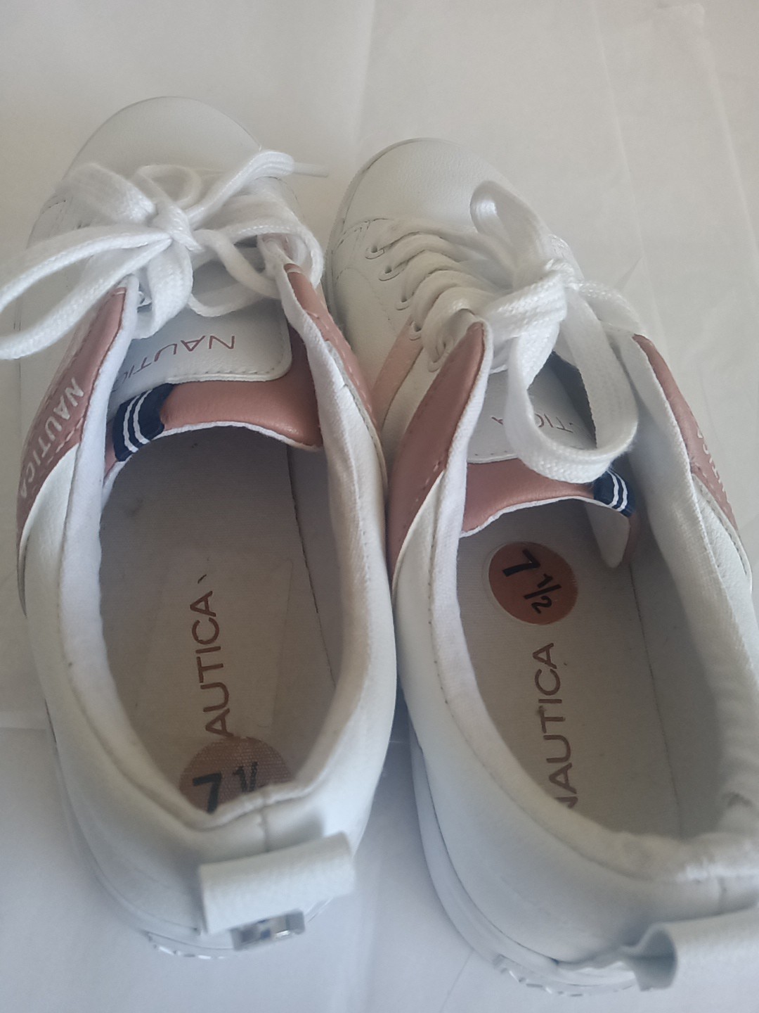 Nautica Women's Tennis Shoes, size 7.5, featuring a crisp white base with soft pink stripes. These athletic shoes combine both style and function, ensuring you move with agility and comfort. The striped pattern adds a touch of femininity to your sporty ensemble, while the premium materials and reputable Nautica brand assure quality. Preppy, Nautical, Athleticore.