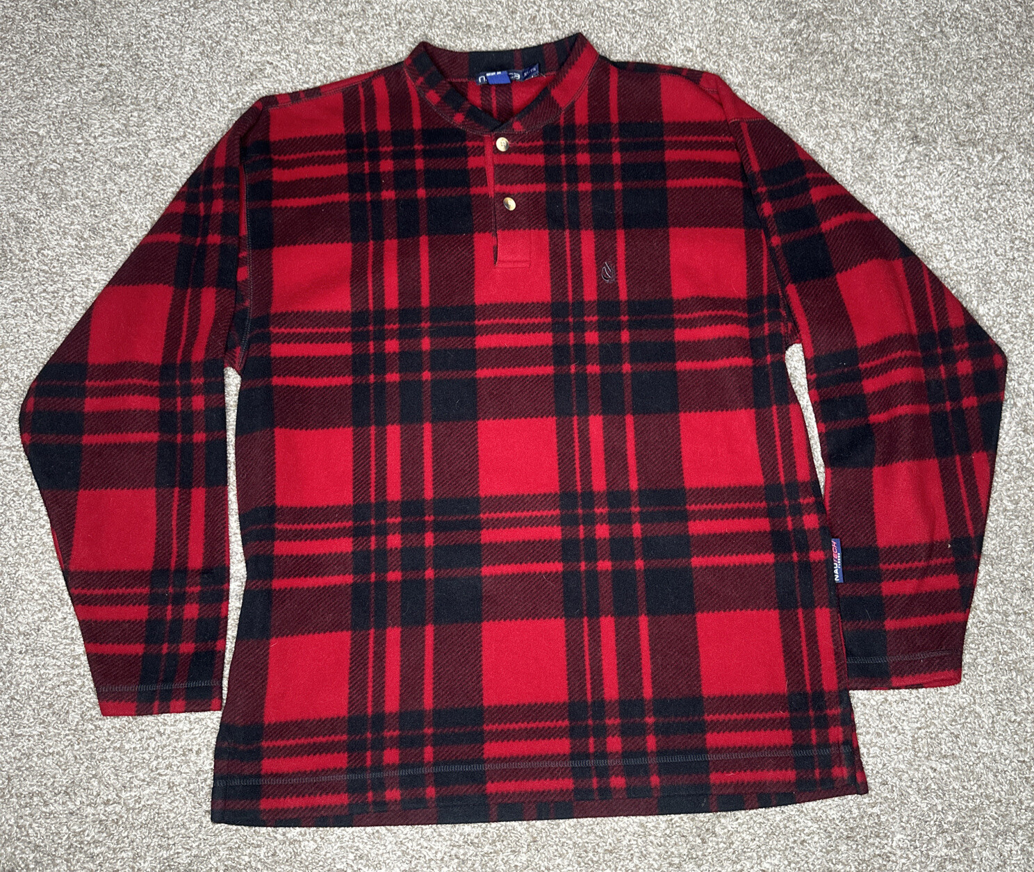 Made in the USA! Please see the pictures for an accurate description. Same-day business shipping. Elevate your winter and fall wardrobe with this vintage Nautica "Nautech Fleece" long-sleeved pullover. The red and black plaid pattern is perfect for outdoor activities and sports. The 1/4 zip feature adds a touch of classic style to this XL size regular fit jacket. Made in the United States, this jacket is 100% polyester on the outer shell and lined with soft polyester material. The fleece fabric type and insulation material of polyester ensure warmth and comfort during the coldest days. This jacket also features embroidered logo accents and is suitable for travel and casual occasions.