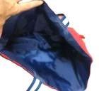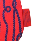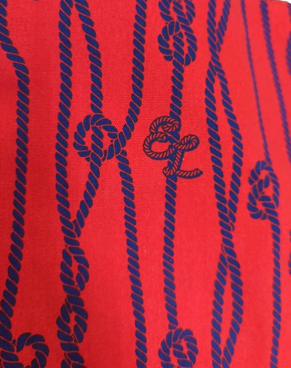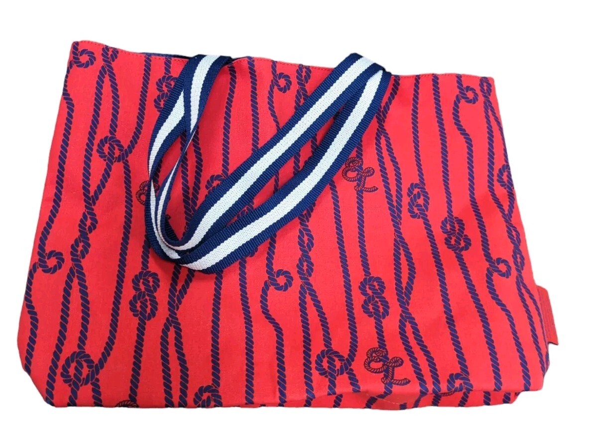 This is a medium-sized canvas tote bag from Estee Lauder. The bag features a red exterior with a navy blue knotted rope design, and blue and white stripped double handles. The interior is lined with blue fabric and has a width of 17 inches, height of 12.5 inches, and depth of 3 inches. The strap drop is 9 inches. It is perfect for a beach day or a casual outing. No rips, stains or odors.