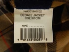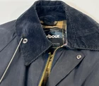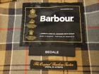 Barbour Bedale Jacket. Good except for a faded/stained area on the corduroy collar next to the snap The chest measurement (armpit to armpit) is 20 inches across The center back length of the jacket is 27 inches The sleeve length is 30.5 inches collar to end of sleeve