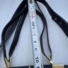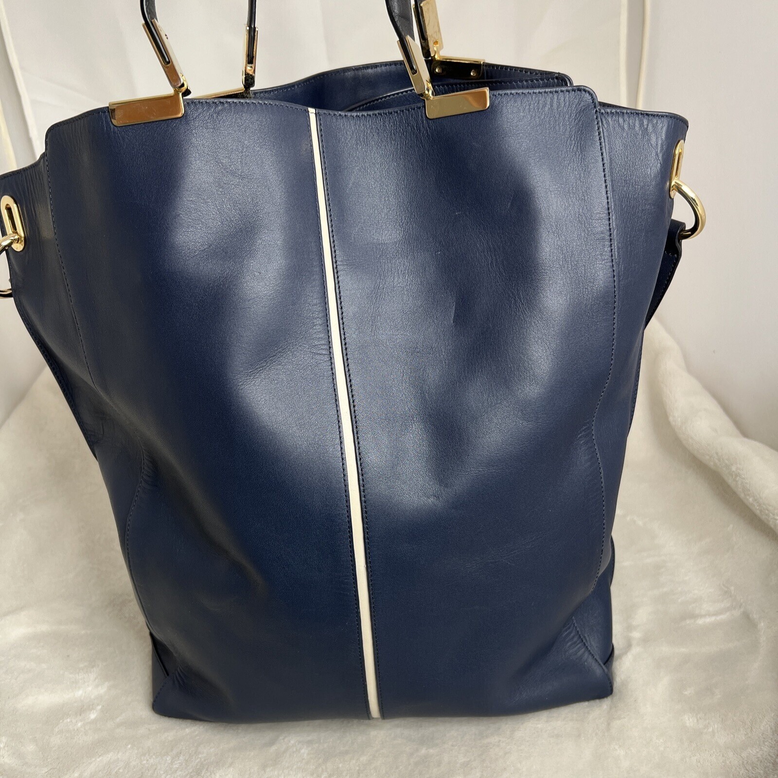 This tote is so spacious it might just double as a black hole for your belongings—stylish, with gold hardware and a classy white stripe. • Dimensions: 14 Inches Wide (Approximate) • Two Interior Pockets For Organization • Adjustable Shoulder Strap And Dual Handles • Durable Leather With Gold Accents Minor scuffing on leather exterior. Interior is clean with slight wear. Measurements: Width = 14 inches, Height (from top to bottom) = 13 inches.