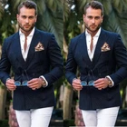 Navy Blue Striped Men's Suits Double Breasted Peak Lapel Wedding Tuxedo 2 Pieces