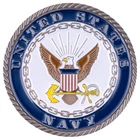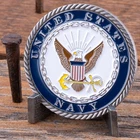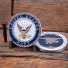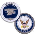 Navy Seal Coin This 1.75" antique silver challenge coin features a 3D Navy Seal emblem on a dark blue background, topped with the words "AIR," "LAND," and "SEA," separated by raised metal stars. The design is surrounded by a white border that reads "NAVY SEAL" at the top. The reverse side features the Department of the Navy Emblem in full color, and is encircled by rope line edge effects. Both sides are covered with a protective clear epoxy coating. A stunning addition to any challenge coin collection!