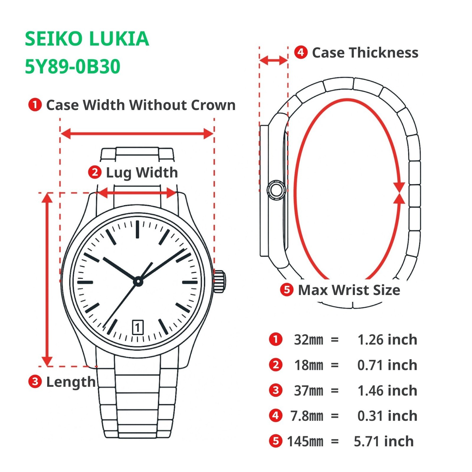 π°οΈ Authentic Timepiece β Overview Brand: Seiko Model: Lukai 5Y89-0B30 Movement: Quartz Condition: Near MINT (Rank A) β Very well preserved with minimal signs of use Case Color: Silver (A) Dial Color: White (S) Band: Original silver-tone bracelet (A β very good condition) Crystal: Clear, no visible scratches (A) Wrist Size: Approx. 5.7 in / 145 mm Case Size: Approx. 32 mm Accessories: Watch only (no box or papers) Note: β Condition Details Part Description Rank Case Silver-tone, minimal signs of wear A Dial White dial, pristine condition S Band Original silver-tone bracelet, very good condition A Crystal Clear, no noticeable scratches A Battery Notice The battery has not been replaced prior to listing. As this is a pre-owned item, the remaining battery life is unknown and may require replacement soon. Battery performance is not guaranteed. Shipping & Packaging Ships from Japan. Each item is carefully packed with protective bubble wrap and a secure box. Orders ship within 4 business days after payment confirmation. β Orders placed after 12:00 PM JST on Friday will ship on or after the following Monday. Carriers: FedEx / DHL / Japan Post (ePacket Light) Our Packaging Process Step 1: Crystal protected with film and secured on a cushion Step 2: Wrapped securely with bubble wrap Step 3: Packed in a gift-style box Step 4: Double-boxed for extra protection We take pride in packaging each item with great care to ensure safe delivery. π¦ If an original box is included, we will use the original box for shipping. Important Notice This is a pre-owned item. Minor signs of use should be expected. Import taxes/duties are NOT included in the price β buyer is responsible. Returns for size issues or buyer's remorse are not accepted. Buy with Confidence All items are inspected and packed with care. We have years of experience selling luxury watches worldwide. Please feel free to contact us with any questions before purchasing. Explore More from Our Store SEIKO GUCCI OMEGA LONGINES Other Watches Β© 2025 japan_watch_samurai. All rights reserved.