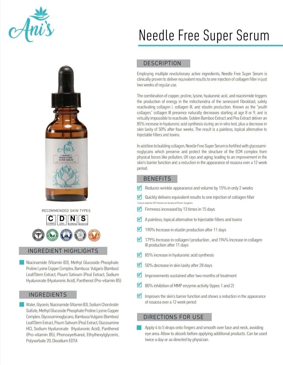 Needle Free Super Serum – A Painless, Effective Alternative to Collagen Fillers & Toxins Experience the revolutionary power of the Needle Free Super Serum , a clinically proven, topical solution that delivers results comparable to collagen filler injections in just two weeks of regular use. This advanced serum combines copper, proline, lysine, hyaluronic acid , and niacinamide , which work synergistically to trigger energy production in skin cells, reactivating the natural production of collagen I , collagen III , and elastin . With its unique formula, it is a pain-free alternative to injectable treatments that visibly smooths wrinkles and improves skin firmness. The Needle Free Super Serum goes beyond boosting collagen; it also contains Golden Bamboo Extract and Pea Extract , which support the synthesis of hyaluronic acid by 85% , improving skin hydration and elasticity. After just 28 days , this serum helps to reduce skin laxity by 50% , giving the skin a firmer and more lifted appearance . This product’s formula also promotes elastin production by 190% after just 11 days , helping skin retain its natural resilience and youthful bounce. In addition to its anti-aging effects, this serum offers protection against environmental stressors like UV rays and pollution, while improving skin barrier function. Over the course of 12 weeks , it is shown to reduce the appearance of skin conditions like rosacea, making your skin feel smooth, revitalized , and visibly healthier . Key Benefits: Reduces Wrinkles – Decreases the appearance and volume of wrinkles by 15% in just two weeks Collagen Boost – Increases collagen production by 179% (collagen I) and 194% (collagen III) in 11 days Firmness & Elasticity – Boosts skin firmness by 13 times in just 15 days Hyaluronic Acid Synthesis – Enhances hyaluronic acid synthesis by 85% , keeping skin hydrated and plump Sustained Results – Shows lasting improvements after two months of consistent use Skin Protection – Supports the skin’s barrier and reduces the appearance of rosacea over 12 weeks Non-Invasive – A painless alternative to fillers and toxins with no injections required How to Use: Apply 4-5 drops to your fingertips. Gently spread the serum across your face and neck , avoiding the eye area. Allow the serum to fully absorb before applying any additional skincare products. Use twice daily or as directed by your skincare professional for best results. With the Needle Free Super Serum , achieve a younger, smoother, and firmer complexion without the need for needles or invasive procedures. Discover the future of skincare with a serum that transforms your skin effortlessly. ✨