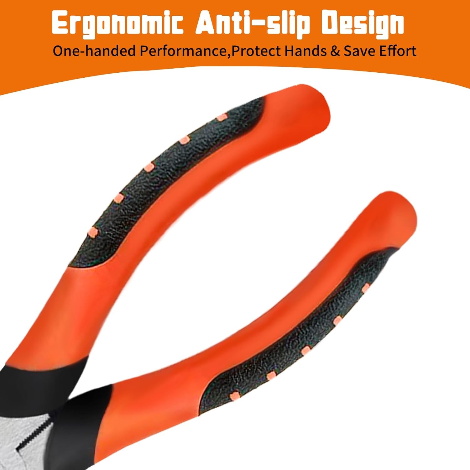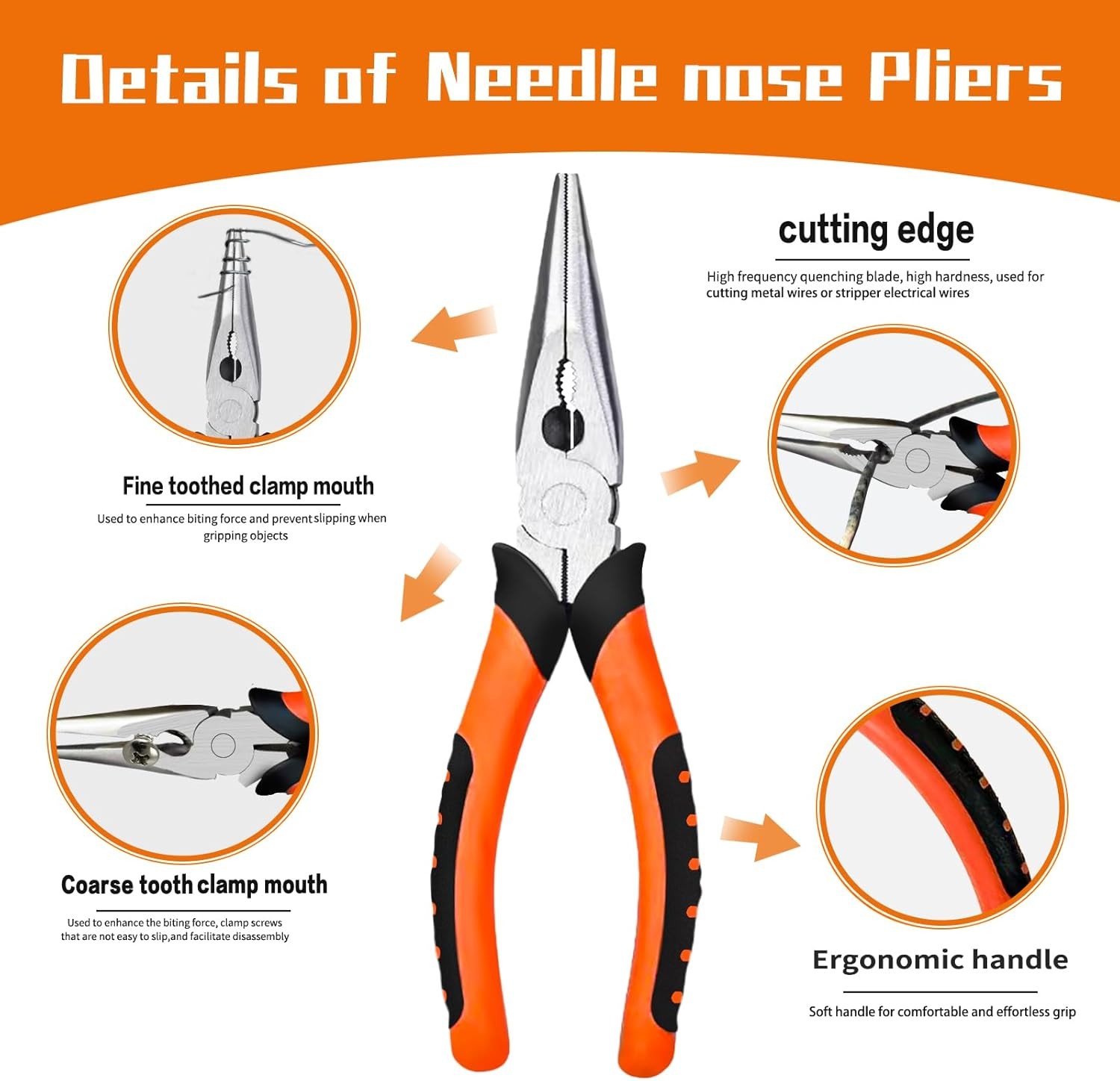 About this item 【High quality & Sturdy 】Needle nose pliers set are made of high quality forged material,sturdy and long service life,the surface is professionally polished and nickel plated which is pretty nice and corrosion resistance. 【Outstanding Manufacturing Process】Our pliers reached the A4 clamping standard which closed well on the ends of pliers.Heat-treated hardness of the needle nose pliers up to 48 HRC,The cutting edge with high-frequency Heat-treated that hardness up to HRC 65. 【Comfortable Ergonomic Handle】The handle of need nose pliers are manufactured with high quality soft Bi-materials,which are ergonomic and comfortable to hold without slipping. 【Perfect Gift Chioce 】Pliers set is a great gift for your family,friends on Mother's/Father's Day,Christmas,Thanksgiving,Birthday etc. 【Customer Service】We attach great importance to customer after-sales service,if you have any questions about our products,please feel free email to us,we will reply to you with 24H.