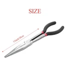 Needle-Nose Pliers 11 Inch Super Long Needle-Nose Pliers with Long Handle9201 The whole tool steel body is quenched at high temperature, and the clamp head is quenched twice, firm and firm, the handle is made of plastic, the is grainy, and the anti-slip and oil-proof effect is good, long handle, tip nose and professionally designed jaws are suitable Suitable for operation in tight spaces. Wide application, suitable for working in small spaces and special situations. Novel design, can adapt to a variety of special working conditions, , convenient and practical. Specification: 11 inches Item type: needle nose pliers Application: The combination of lathe and turning tool can produce different jobs Colour:silver Material:Tool steel Size:about 28cm Package Contents: 1 x needle nose pliers Only the above package content, other products are not included. Note: Light and different displays may cause the color of the item in the picture a little different from the real thing. The measurement allowed error is +/- 1-3cm.