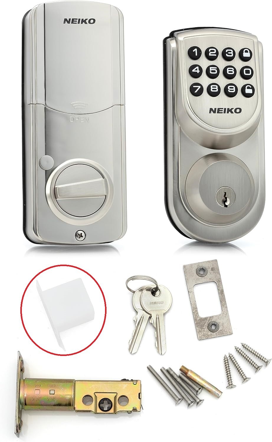 Neiko 52909A Auto Locking Keyless Electronic Deadbolt Keypad Lock Brushed Silver Condition *The circled piece is missing. See photos.* Open Box Item - Store Return - Excellent condition, may have light signs of handling - Includes original packaging but there may be light damage to packaging - Guaranteed to function perfectly. Features AUTO LOCKING FEATURE: Electronic keypad deadbolt door lock allows you to set the door to automatically lock after 20 seconds to 900 seconds. The keyless entry door lock combines confidence and technology eliminating keys with a passcode unlock for granting access to family and friends. EASY INSTALL with DIY INSTRUCTIONS: Install in minutes with just a screwdriver. No locksmith and no wiring needed. Template and all hardware included. Works with both right hand and left-handed doors. SECURE KEYLESS ENTRY: Front door lock set keyless entry with deadbolt comes with 2 standard keys included to override a code as backup or open without a code. Battery operated for use in a power outage. DURABLE & SECURE: Our electronic keyless entry door lock deadbolt is constructed of zinc alloy internals, stainless steel for end and strike plates with keypad for easy access at all times of day with this keyless entry door lock with handle and deadbolt. KEYLESS ENTRY & 100 USER CODES: Our keyless door lock with keypad allows you to create & delete up to 100 access codes for quick entry on all doors in home, Airbnb rentals, bedrooms, offices, rentals, and RV’s. PROGRAMMING INSTRUCTIONS: Please download the "Instructions for Use (IFU) (PDF)" below in the “Product guides and documents” section for complete programming instructions. Shipping Free shipping to the Continental United States only. Most Items will ship by UPS or Fedex. Seller may also choose to ship some items by USPS For shipping to Alaska, Hawaii, Puerto Rico or APO/FPO addresses please contact seller with your complete address for a shipping price quote All orders are normally shipped within one business day. We do not ship on weekends or holidays Return Policy Free 30 day returns Powered by SixBit's eCommerce Solution