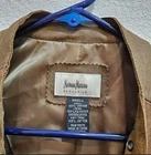 Neiman Marcus Exclusive Brown Leather Jacket with Rings. Has cloth on sleeves. One hole from the tag as shown in pics. Shell: 100% Leather. Lining: 100% polyester Undersleeves knit trim: 100% cotton