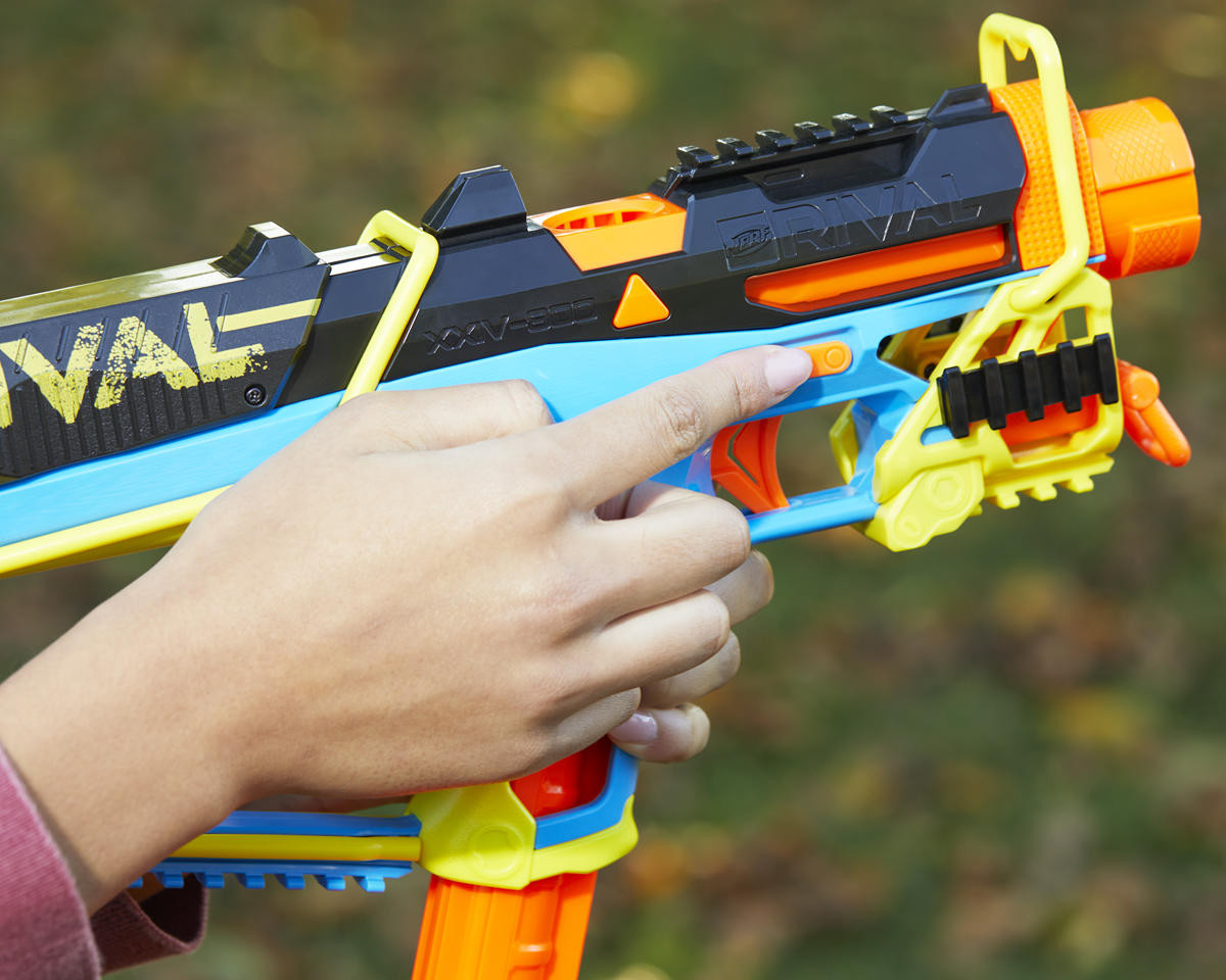 Nerf Blaster Overview: The Hasbro Nerf XXIV-800 Rival Mirage Blaster is a cutting-edge blaster designed to challenge the competition with its innovative loading features and precision performance. Equipped with a streamlined barrel and firing rounds at ninety feet per second, this blaster is perfect for competitive games and thrilling battles. This blaster includes ten Nerf Rival Accu-Rounds with an improved aerodynamic design for more consistent flight. It offers two ways to load the magazine, providing flexibility during intense Nerf Rival games. The Mirage XXIV-800 is designed for teen boys and girls, making it an excellent gift for those looking to elevate their competitive play. NOTE: Protective Eyewear is recommended (not included). Features: 2 ways to load the magazine for flexibility Includes 10 Nerf Rival Accu-Rounds Fires rounds at 90 feet per second Optimized barrel with streamlined design Large front sight and trigger lock 3 Tactical rails for customization Specifications: Ages: 14 and up Blaster Type: Spring-action Loading Methods: Magazine and breech Includes: (1) Hasbro Nerf XXIV-800 Rival Mirage Blaster (10) Nerf Rival Accu-Rounds (1) Magazine (1) Instructions About Us | View Store
