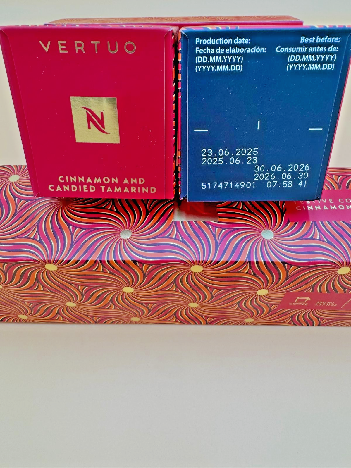 The Nespresso Cinnamon and Candied Tamarind VERTUO coffee pods are a limited edition holiday release for the year 2025 6 Sleeves 60 PODS.. These coffee pods come in a sleeve and are compatible with Nespresso and Nespresso Vertuo machines. The medium roast coffee pods have a unique flavor combination of cinnamon and candied tamarind, providing a festive and aromatic experience for coffee lovers. Each pod is designed to serve one cup of delicious coffee, making it a convenient and indulgent choice for the holiday season.