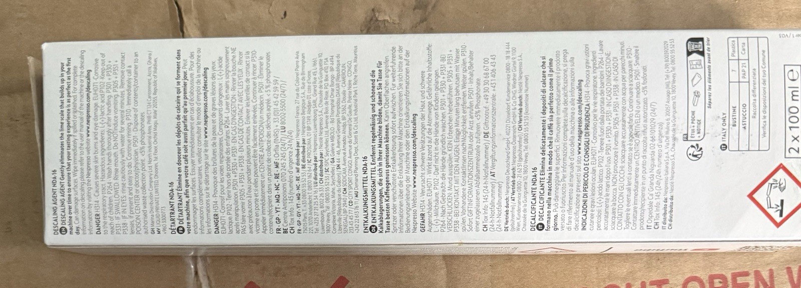The Nespresso Descaling Solution is a 100ml liquid descaler specifically designed for all models of Nespresso coffee machines. Made in Switzerland, this non-toxic solution comes in a pack of 2 units and is compatible with Nespresso coffee machines. The descaler effectively removes limescale build-up to ensure your coffee machine continues to function at its best, maintaining the quality of your Nespresso coffee experience. Perfect for regular use to keep your coffee maker in top condition.