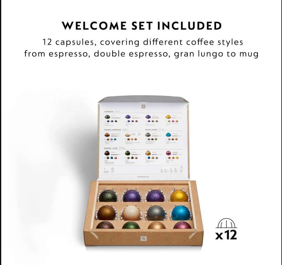 Nespresso Vertuo Pop Coffee & Espresso Maker with Aeroccino – Black – New (Welcome Tasting Set Included) Enjoy café-quality coffee and espresso drinks at home with the Nespresso Vertuo Pop by De’Longhi with Aeroccino Milk Frother . This compact and stylish machine brews rich coffee and espresso using Nespresso’s Vertuo technology, while the Aeroccino frother lets you create smooth hot or cold milk foam for lattes and cappuccinos. Key Features Brews both coffee and espresso with Nespresso Vertuo capsules Aeroccino milk frother for hot or cold milk foam One-touch operation with automatic capsule recognition Rich crema and consistent extraction with Vertuo technology Compact, modern design in black finish Fast heat-up time Specifications Brand: Nespresso by De’Longhi Model: Vertuo Pop Product Type: Coffee & espresso maker with milk frother Color: Black Capsule System: Nespresso VertuoLine Power Source: Electric (corded) What’s Included Nespresso Vertuo Pop Coffee & Espresso Machine Aeroccino 3 Milk Frother Water tank Drip tray Nespresso Vertuo welcome coffee tasting set (included) Power cords Original packaging (if shown in photos)