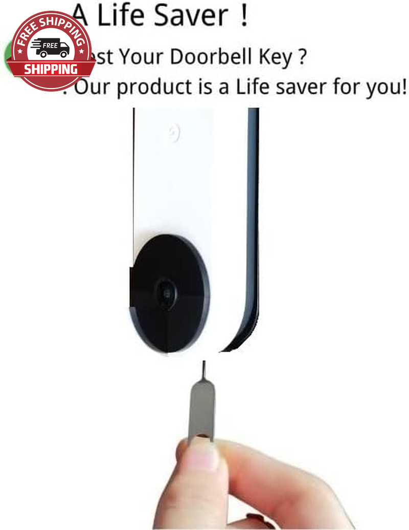 【Lost Your Doorbell Key?】Are you often can't find your Dooerbell key when replacing the battery or resetting your doorbell.This doorbell key tool can replace the lost security key to remove your Doorbell from it's mount. 【For NEST ALRO EUFY Vdeio Dooerbell】Not only for Nest Vedio Doorbell,but ALRO and EUFY Vedio Dooerbell.Please check your doorbell brand. 【Good Quality】Made of 304 stainless steel,it is sturdy,durable and will not deform.You can use it for a long time. 【Anti-lost design】There is a small hole on spare key that can be hung on the key chain to prevent it from being lost. 【Easy to Use】Inserting it into your Nest/EUFY/ALRO Video Doorbell,pulling gently on the doorbell to release it. Lost Your Nest Video Doorbell Key ?-This Replacement Doorbell Key is a life saver for you! Features: Our replacement key for the Nest Video Doorbell is made from 304 Stainless Steel, Strong as original quality. Compatible with Nest Video doorbell Colour: Silver Packing list: .2pcs included. Doorbell Pin Removal Instructions For Use : Step One: Gently grip your doorbell with one hand. Step Two: Insert pin into hole used for release mechanism. Step Three: Apply pressure to the pin while gently wiggling and tugging on your doorbell.
