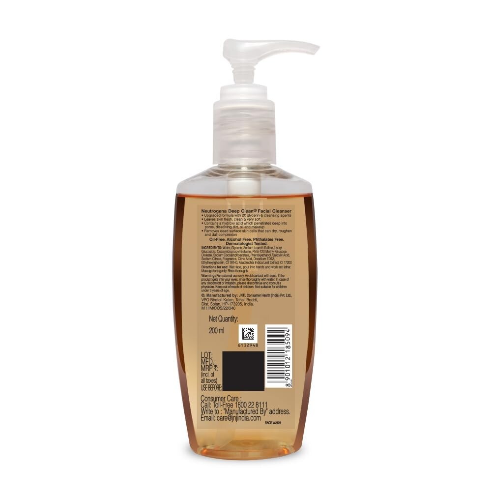 Ingredients: Water, Sodium C14-16 Olefin Sulfonate, Cocamidopropyl Betaine, Salicylic Acid, Sodium Chloride, PEG-120 Methyl Glucose Dioleate, PEG-80 Sorbitan Laurate, C12-15 Alkyl Lactate, Sodium Hydroxide, Disodium EDTA, Fragrance, Polyquaternium-7, Propylene Glycol, Yellow 5, Red 40 Product description Product Description Neutrogena Deep Clean® Facial Cleanser is a penetrating and thorough cleanser that improves the look and feel of skin, resulting in a fresh and healthy complexion. This face wash, suitable for women and men, leaves the skin feeling smooth and soft. Oil-free, alcohol-free. From the Manufacturer Experience Rejuvenated and Glowing Skin Treat your skin to a deep cleansing regime every day with the Neutrogena Deep Clean Facial Cleanser. This Deep Clean Facial Cleanser Neutrogena effectively cleans every pore and dissolves dirt, oil and make up, to reveal a clear, radiant skin, every time you wash. With its non-comedogenic effect, this Neutrogena deep cleanser cleanses your skin without leaving pores clogged and makes your skin healthy, smooth and soft by removing dead cells. This Neutrogena facial cleanser makes you feel fresh and rejuvenated, improves complexion, and keeps your skin glowing at all times. Look Fresh and Bright At All Times Wash your face every day with the Neutrogena Deep Cleanser and let your breathe with freshness. This oil-free face wash cleans the oily skin effectively and removes excess oil on the skin. With effective cleansing properties, this Neutrogena Deep Clean Cleanser thoroughly rids your skin of the impurities. This face was is suitable and effective for normal to oily skin types. For an effective wash, pump a coin-sized portion of the cleanser into your hands and work up lather gently in circular motion on your cheeks and entire face, except the eye area. Brand: Neutrogena Oil-free face cleanser Suitable for Normal to Oily Skin Non-comedogenic - cleans without clogging pores Removes dead cells and dissolves, oil and make up Works up lather for thorough cleansing Rejuvenates and makes skin healthy and glowing Quantity: 200 ml