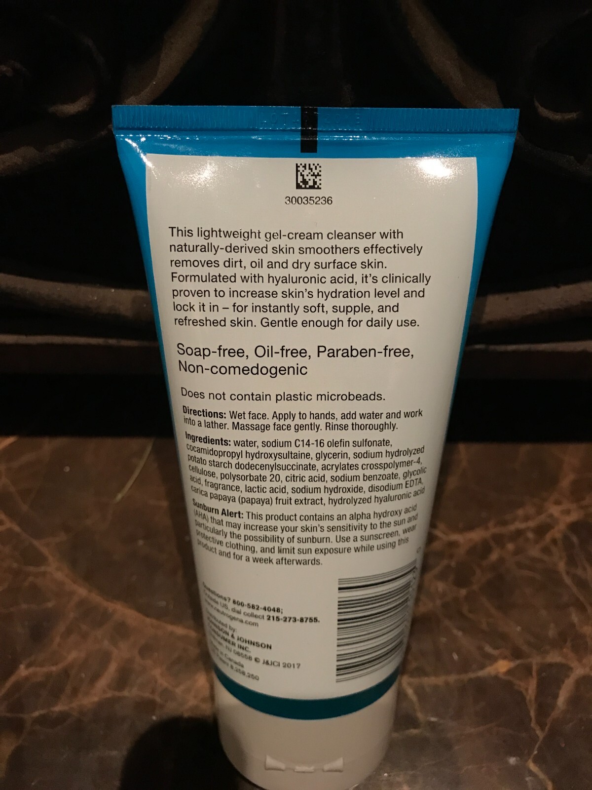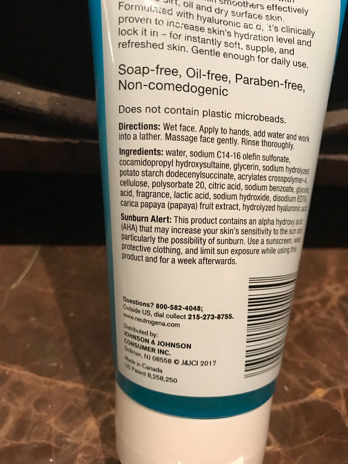 Product details Gently cleanse and exfoliate your skin daily with Neutrogena Hydro Boost Exfoliating Facial Cleanser. Formulated with hydrating hyaluronic acid, this gentle exfoliating daily face wash is clinically proven to increase skin's hydration level and lock it in for instantly soft, supple, and refreshed skin. The lightweight gel-cream cleanser has naturally-derived skin smoothers that effectively remove dirt, oil, and dry surface skin. Gentle enough for daily use, our hyaluronic acid face cleanser is soap-free, oil-free, paraben-free and non-comedogenic. From Neutrogena, a dermatologist recommended brand, use this daily cleanser as a part of your skincare routine. To use, wet face, apply daily facial cleanser to hands and work into a lather. Gently massage face and rinse skin thoroughly. Neutrogena Hydro Boost Daily Exfoliating Face Cleanser with Hyaluronic Acid to gently cleanse skin Gentle face wash contains naturally-derived skin smoothers that remove dirt, oil & dry surface skin Formulated with hyaluronic acid, cleanser is clinically proven to increase skin's hydration level Gentle Hydro Boost exfoliating facial cleanser provides instantly soft, supple & refreshed skin This lightweight gel-cream hyaluronic acid exfoliating face wash is gentle enough for daily use The exfoliating face wash boosts skin's hydration & is formulated to be soap-, oil- & paraben-free The unique formula of this daily hydrating facial cleanser is non-comedogenic & won't clog pores From the dermatologist recommended brand, use this cleanser as a part of your daily skincare routine Specifications Features Manufacturer Johnson & Johnson Assembled Product Weight 0.36 lb Assembled Product Dimensions (L x W x H) 1.96 x 3.06 x 6.10 Inches Indications Skin Care Concern Dryness Directions Dosage Wet face. Apply to hands, add water and work into a lather. Massage face gently. Rinse thoroughly. Instructions Wet face. Apply to hands, add water and work into a lather. Massage face gently. Rinse thoroughly.Questions? [phone removed by eBay]; Outside US, dial collect [phone removed by eBay]. [link removed by eBay] Ingredients Inactive Ingredients Water Sodium C14-16 Olefin Sulfonate Cocamidopropyl Hydroxysultaine Glycerin Sodium Hydrolyzed Potato Starch Dodecenylsuccinate Acrylates Crosspolymer-4 Cellulose Polysorbate 20 Citric Acid Sodium Benzoate Glycolic Acid Fragrance Lactic Acid Sodium Hydroxide Disodium Edta Carica Papaya (Papaya) Fruit Extract Hydrolyzed Hyaluronic Acid Ingredients Water, sodium C14-16 olefin sulfonate, cocamidopropyl hydroxysultaine, glycerin, sodium hydrolyzed potato starch dodecenylsuccinate, acrylates crosspolymer-4, cellulose, polysorbate 20, citric acid, sodium benzoate, glycolic acid, fragrance, lactic acid, sodium hydroxide, disodium EDTA, carica papaya (papaya) fruit extract, hydrolyzed hyaluronic acid Active Ingredients Hyaluronic Acid Active Ingredient Name Hyaluronic Acid