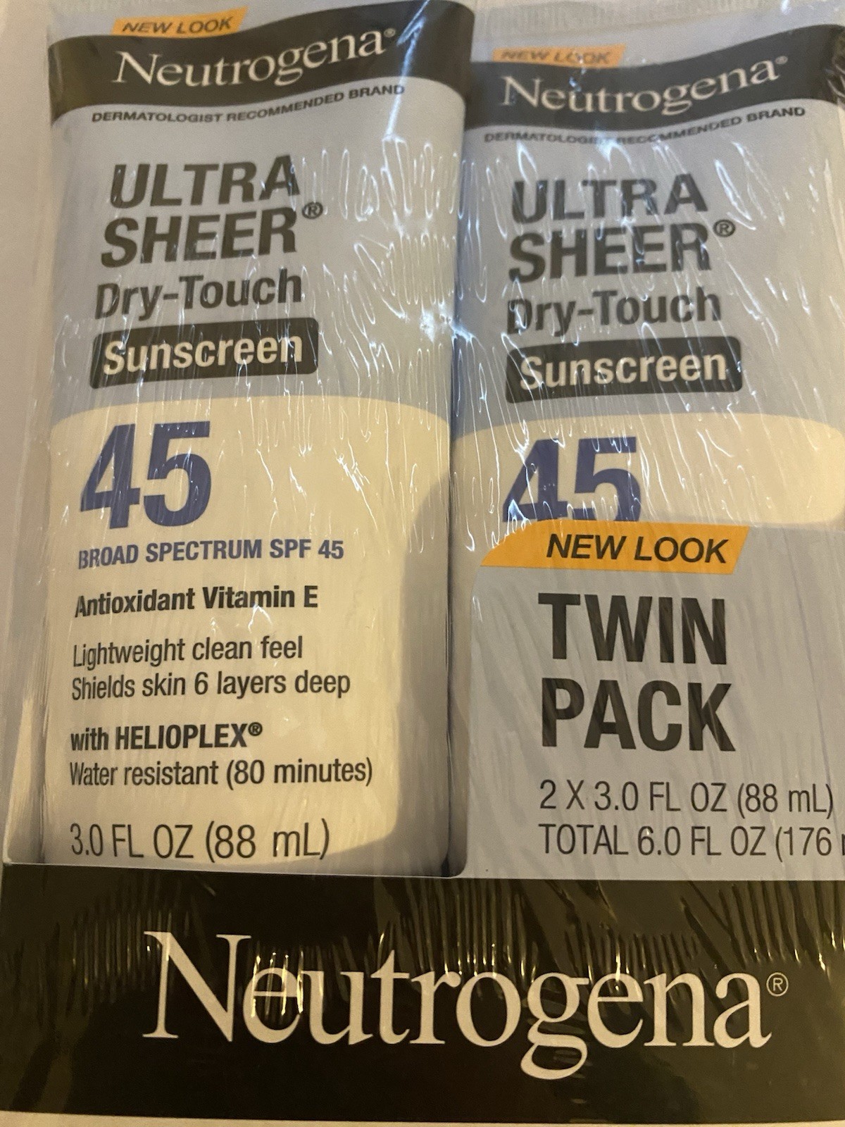 The Neutrogena Ultra Sheer Dry-Touch Sunscreen Lotion SPF 45 3 oz Twin Pack is a physical (mineral) sunscreen suitable for all skin types. With a high SPF of 45 and broad spectrum UVA protection, this lotion provides reliable sun protection for full body use. Its lightweight and non-greasy formula leaves a dry, powdery feel, making it perfect for everyday wear. With the added benefit of being water-based, this sunscreen is both effective and easy to apply.