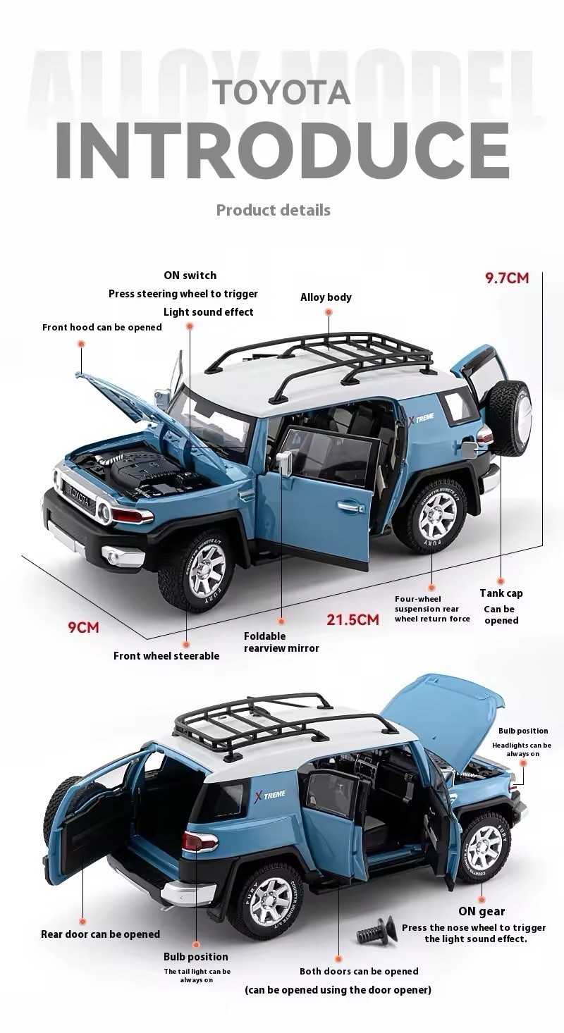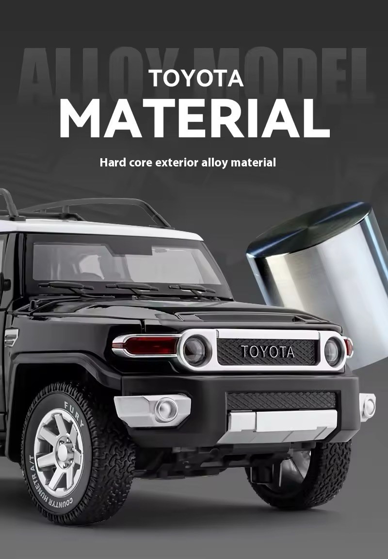The product is a 1:24 scale diecast model car of the Toyota FJ Cruiser off-road SUV. This alloy replica comes in classic colours like white, blue, yellow, and black, making it a perfect choice for hobbyists and collectors. Its detailed design and sturdy metal construction make it a great gift for car enthusiasts of all ages, from 4 to adults. With its official Toyota Land Cruiser series and realistic features, this model car is a must-have for anyone interested in collecting diecast vehicles. Made in China, this 2023 model is a standout addition to any collection.