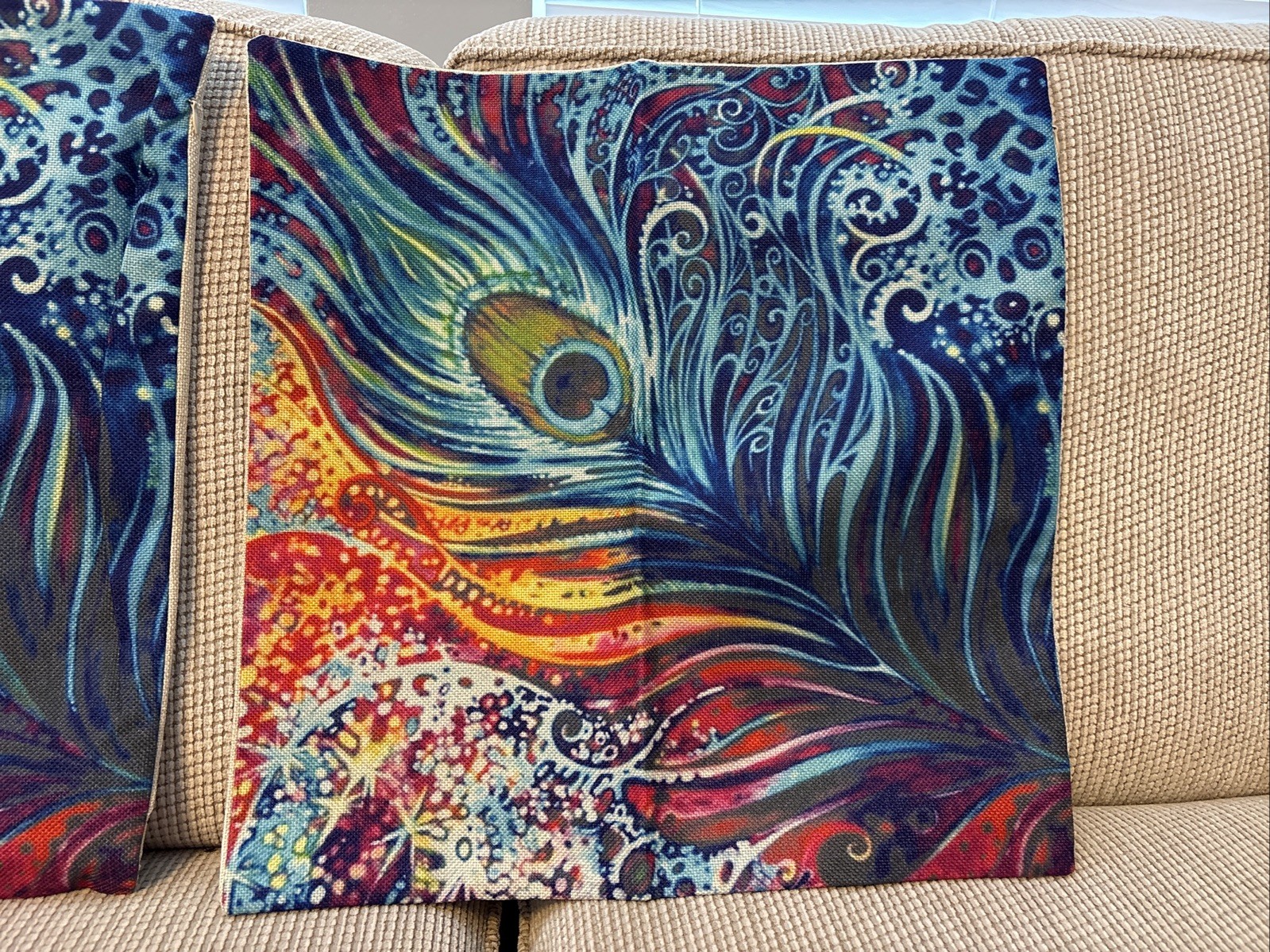 I have two sets of these listed. New, only removed from package to take photos. Elevate your home décor with these exquisite throw pillow covers, showcasing a captivating peacock feather pattern that adds a touch of elegance to any room. The abstract arts color palette brings a contemporary edge to Art Deco style, making these covers a perfect match for modern and traditional settings alike. Crafted from high-quality burlap material, these 17x17 inch pillow covers are designed to withstand the rigors of daily use while maintaining their luxurious feel. Whether adorning your couch, bed, or favorite seating area, these decorative pillow covers are sure to enhance your space with their unique charm and sophisticated design.