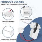 New 242077702 Refrigerator Evaporator Fan Motor Replacement Compatible with Frigidaire Kenmore Blower Motor Parts Replaces 242077705,PS12728811,FDQC18EL4F,5304514392,242077701,242219201,AP6892595 Description Features: Excellent Performance: 242077702 Refrigerator Evaporator Fan Motor is made of high-quality durable materials and has been rigorously tested by the factory to ensure safe, durable and effective performance. Standard OEM accessory size at less than half the OEM price Perfect Fit: 242077702 Refrigerator Evaporator Fan Motor replaces 2477705, PS12728811, FDQC18EL4F, 5304514392, A03788604, 242077701, 242219201, AP6892595. It fits just like the original. Widely Compatible: 242077702 Refrigerator Blower Motor compatible with Frigidaire, Kenmore, Crosley Refrigerators. FIT MODELS: 25360002412, 25360082417, DFHS2313MFEA, FFSS2314QS5A, FFHT1521QW2, FFTR2021QB7A, FFTR2021QB6A, FFTR2028SP1, 25360504411, 25360504410, 25360504413, 25360504412, FFHT1521QW0, FFHS2622MBPA, FFSS2314QS6A, FFHT1521QW1, CRSH232PSCA, CRSH268MS9, FFTR1514RW0, 25360082410, 25360082412, 25360082411, 25360082414, FGHT1835SF0, 25360082413, 25360082416, 25360082415, FFTR18D2QW4A, 25360402410, FFSS2314QS7A, 25360402414, 25360402413, 25360402412, 25360402411, 25360402415, FFTR2032TE0, FFUI1826MW0 etc. Easy to Install: 242077705 frigidaire evaporator fan motor is easy to remove and install, helping you easily solve the problem of too hot refrigerator. You can find a video on how to install the 242077702 motor on YouTube. One person can do it. This will save you maintenance costs and labor costs. Perfect replacement for your old faulty motor. 365-Days Warranty: OEM 242077702 kenmore evaporator fan motor supports return and exchange service, and provides a 1-year warranty. If you have any questions about product performance and suitability, please feel free to contact us, we provide you with 7/24H online service. Product Details: Brand: M Motico Model Name: 242077702 Refrigerator Evaporator Fan Motor Speed: 2600 RPM Voltage: 115 Volts Horsepower: 2.5 Watts Package Dimensions : 5.24 x 3.62 x 3.23 inches; 4.66 ounces Item model number : 242077702 Date First Available : February 16, 2024 Manufacturer : M Motico Country of Origin : China Best Sellers Rank: #401,891 in Tools & Home Improvement (See Top 100 in Tools & Home Improvement) #606 in Refrigerator Replacement Motors #606 in Refrigerator Replacement Motors Customer Reviews: 5.0 5.0 out of 5 stars 1 rating Handling We will ship all orders within 3 business day of payment. Delivery We Do Not Ship Outside of the Continental US. Return Policy All items qualify for returns within 30 days of receipt. Buyer is responsible for return shipping on any item that is not damaged. Feedback We take our reputation seriously, we buy and sell online, so we understand the value of trust. If you are unsatisfied with your order, please contact us and we will work with you to resolve it to your satisfaction.