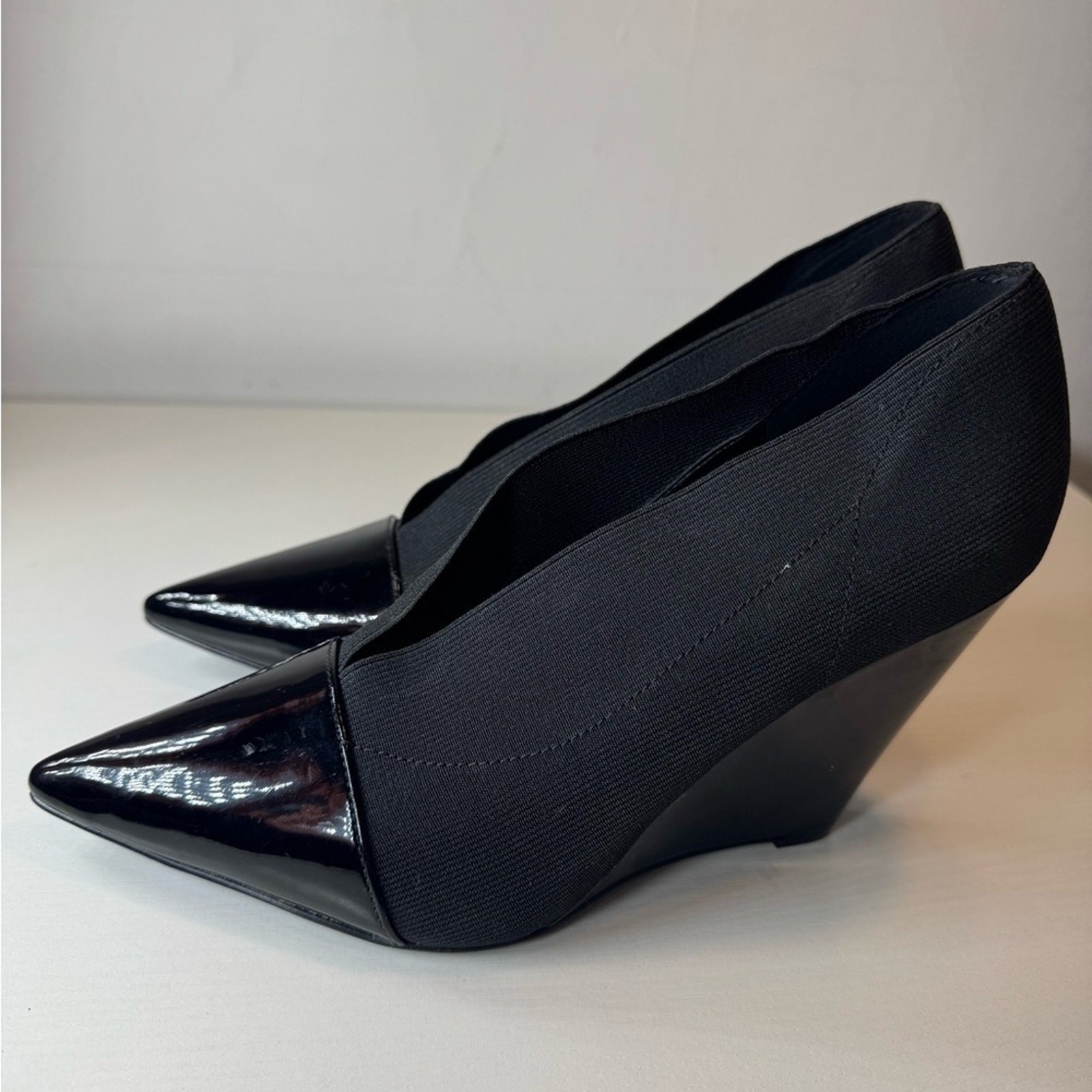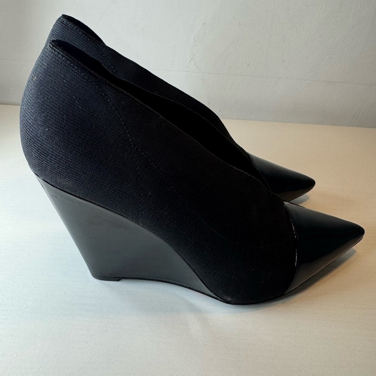 Sharp intense and brand new High end mock design 7.5 Wedge heel Black point toe with matte fabric and gloss tipBundle to save on total price and shipping! Message me for your custom offer.