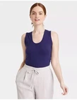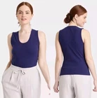 This is a navy blue U-neck tank top from the brand A New Day in size Large. It features a slim fit, sleeveless design, and a scoop neckline. Made of a blend of polyester, spandex, and cotton, this tank top is easy to care for as it is machine washable. The simple and basic style makes it a versatile piece for the summer and spring seasons, perfect for casual and everyday wear.