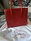 This authentic Christian Louboutin Medium Paloma Studded Leather Satchel Bag in Bordeaux is a stylish and versatile accessory for any occasion. The rectangular shape and medium size make it perfect for a wedding, party, or casual outing. The studded accents and silver tone hardware add a touch of edginess, while the leather strap handle and red lining add a pop of color. Crafted from pebbled leather with a crossbody strap handle, this designer bag exudes luxury and sophistication, embodying the iconic Christian Louboutin Paloma collection. Made in Italy, this bag is a must-have for those who appreciate high-end fashion and quality craftsmanship.