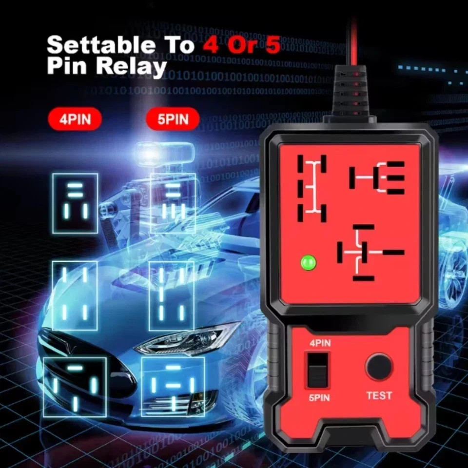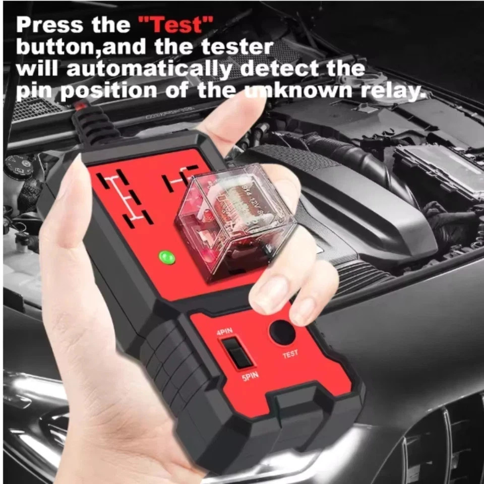 New Automotive Electronic Relay Car Relay Tester Universal 12V LED Indicator Description: The CNBJ-707 Car Relay Tester is a quick and reliable tool designed to test the health and functionality of most common automotive relays. It provides a clear indication of relay performance through LED lights — green for pass and red for fail . By connecting directly to a 12V car battery, this tester checks pin configuration, relay contact timing, and consistency during operation. Compact, efficient, and easy to use, it’s an essential tool for both professional mechanics and car enthusiasts. Uses: Ideal for automotive electricians, car repair workshops, and DIY mechanics . Quickly diagnose relay failures, contact issues, or wiring faults . Ensures proper performance of vehicle electronic systems. Key Features: Universal Compatibility: Works with most 12V automotive relays (4-pin and 5-pin). LED Indicator Lights: Green light for successful test, red light for failure. Quick & Accurate Testing: Checks pin configuration, contact timing, and relay consistency. Easy Operation: Simple plug-and-test design—connect to the battery, insert relay, and press test. Safe to Use: Designed for 12V car batteries (11V–15V range) with coil resistance above 20 ohms. Compact & Portable: Lightweight and durable design for workshop or on-the-go use.