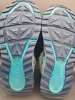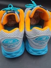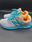 New Balance 512 Running Shoes for Women in Size 9. These sneakers feature a teal, gray, and orange color combination with a lace-up closure. They are crafted with a lightweight mesh fabric upper and a durable rubber outsole. The shoes offer comfort and are suitable for various activities like running, cross-training, and basketball. Perfect for outdoor adventures in all seasons.