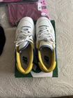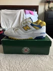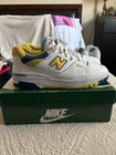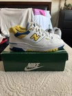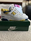 You are bidding on a used pair of new balance 550 BB550NCG sneakers. Replacement box will be sent the original box was damaged. The sneakers are in almost perfect condition they were worn a handful of times. Show very little to no wear. They are a perfect blend of comfort and style. These shoes feature a sleek multicolor design with a blue, yellow, and white palette that adds a pop of color to any outfit. Designed for men, they come in a US size 11.5 and are crafted with a durable leather upper material and a supportive rubber outsole, ensuring both longevity and traction. Enjoy the versatility of these athletic sneakers, ideal for both activewear and casual outings. The low-top shaft style and standard width offer a comfortable fit, while the cushioned insole and fabric lining provide all-day comfort. Whether you're hitting the basketball court or just going about your day, these sneakers are built to keep up with your active lifestyle across all seasons.