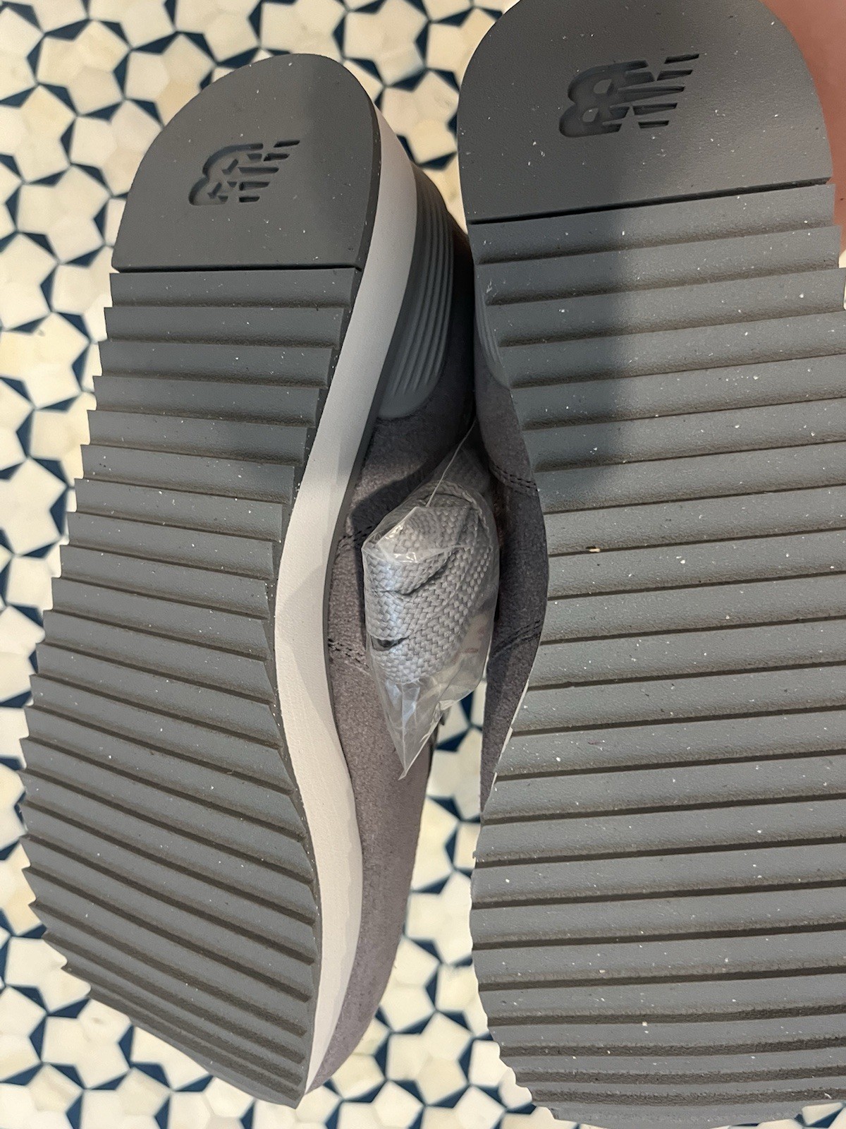 The product is a pair of New Balance 574+ athletic shoes in size 10 for women. These sneakers are designed in a sleek grey color and are perfect for athletic activities or casual wear. With the iconic New Balance branding and comfortable sneaker style, these shoes are a stylish and practical choice for any woman's wardrobe.