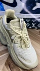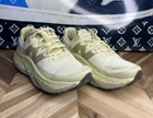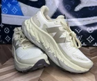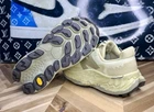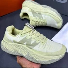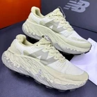 New Balance Fresh Foam More Trail v3 sneakers in Pistachio Butter color, featuring Vibram soles for traction. This unisex pair is in Men's size 6 and Women's size 7.5 with a lace-up closure. Designed for various outdoor activities like hiking and trail running, they are part of the 900 series with Fresh Foam X More technology for enhanced performance and comfort. Ideal for those seeking a stylish and functional athletic shoe.