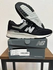 New Balance Men's 997H Sneakers in Black/Grey, size 10, were manufactured in 2018. These lace-up sneakers feature a colorblock design with a low-top shoe shaft style. They are cushioned, comfortable, and breathable, suitable for various occasions like activewear, casual, and workwear. The shoes are part of the New Balance 900 Series, ideal for gym training, walking, running, and other fitness activities.
