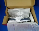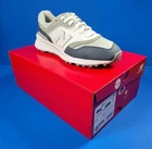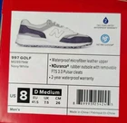 The product is a pair of New Balance men's navy and white 997 golf shoes in size 8. These athletic sneakers feature a low top shaft style with a lace-up closure, designed for optimal comfort and performance on the golf course. The upper material is made of leather, with a synthetic lining and foam insole for added cushioning. The outsole is made of rubber for traction, and the shoes are designed to be waterproof and provide memory foam support for long-lasting comfort during active wear. Perfect for any golfer looking for high-quality, stylish footwear for their game.