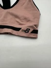 The product is a women's sports bra by New Balance in size Small. It features a solid pink color with the brand's logo on the front. The closure is a pullover style, making it easy to put on and take off. Made of a blend of polyester and cotton, this sports bra is designed for activewear use and offers easy care for convenience. Perfect for active women looking for a comfortable and supportive sports bra. *Check the images above for the flaws and measurements of the item.