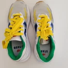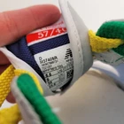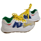 New Balance x Staud limited edition collaboration 57/40 shoes Size 5.5 men or 7 women Leather and PVC upper EVA foam midsole for cushioning Rubber outsole Low top style Blends road and trail features Bold '80s-meets-'90s lifestyle sneaker White with multicolor accents in blue, yellow, red, green with yellow laces Good pre-owned condition. Refer to photos for small scuffs and wear streetwear, throwback 80s meets 90s, unisex
