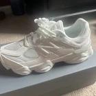 The New Balance sneakers are brand new and come in a womens UK shoe size 6.5 or US size 7. They are designed in a classic white color with a sleek athletic style. These sneakers are perfect for casual wear or sports activities, offering both comfort and style with the iconic New Balance brand.