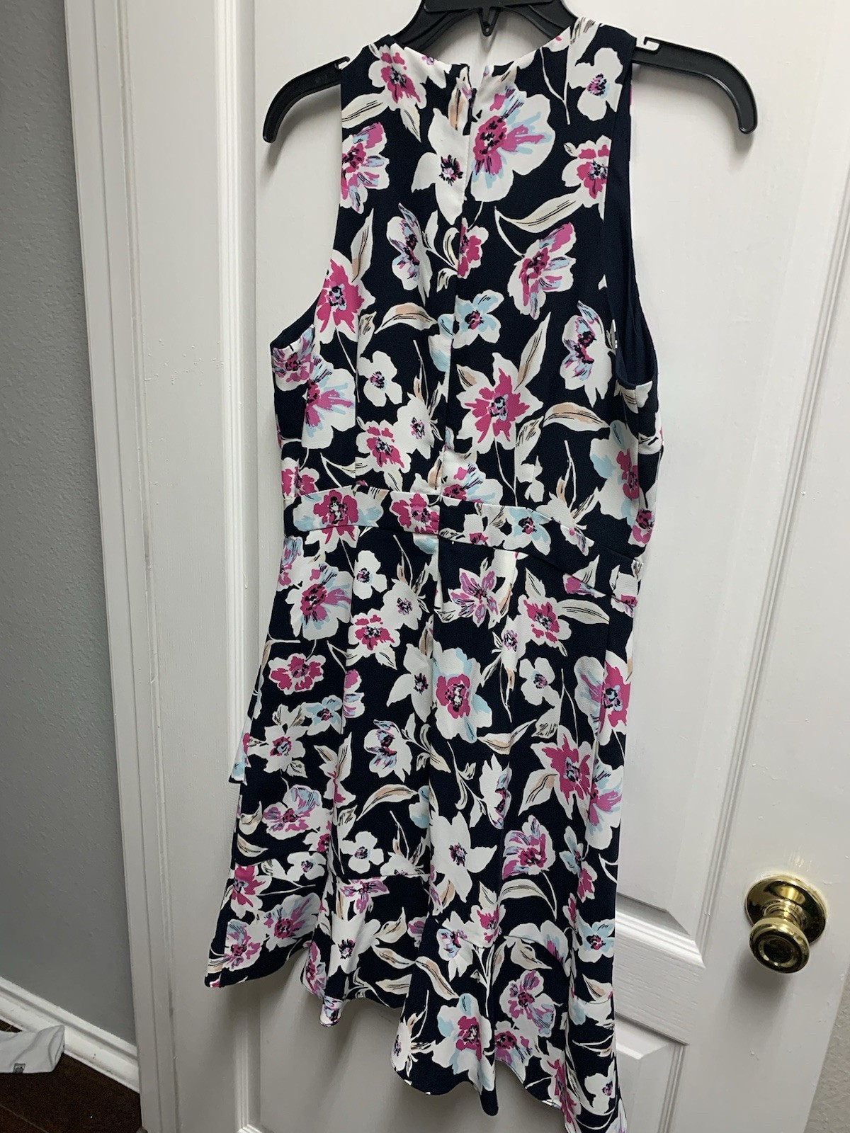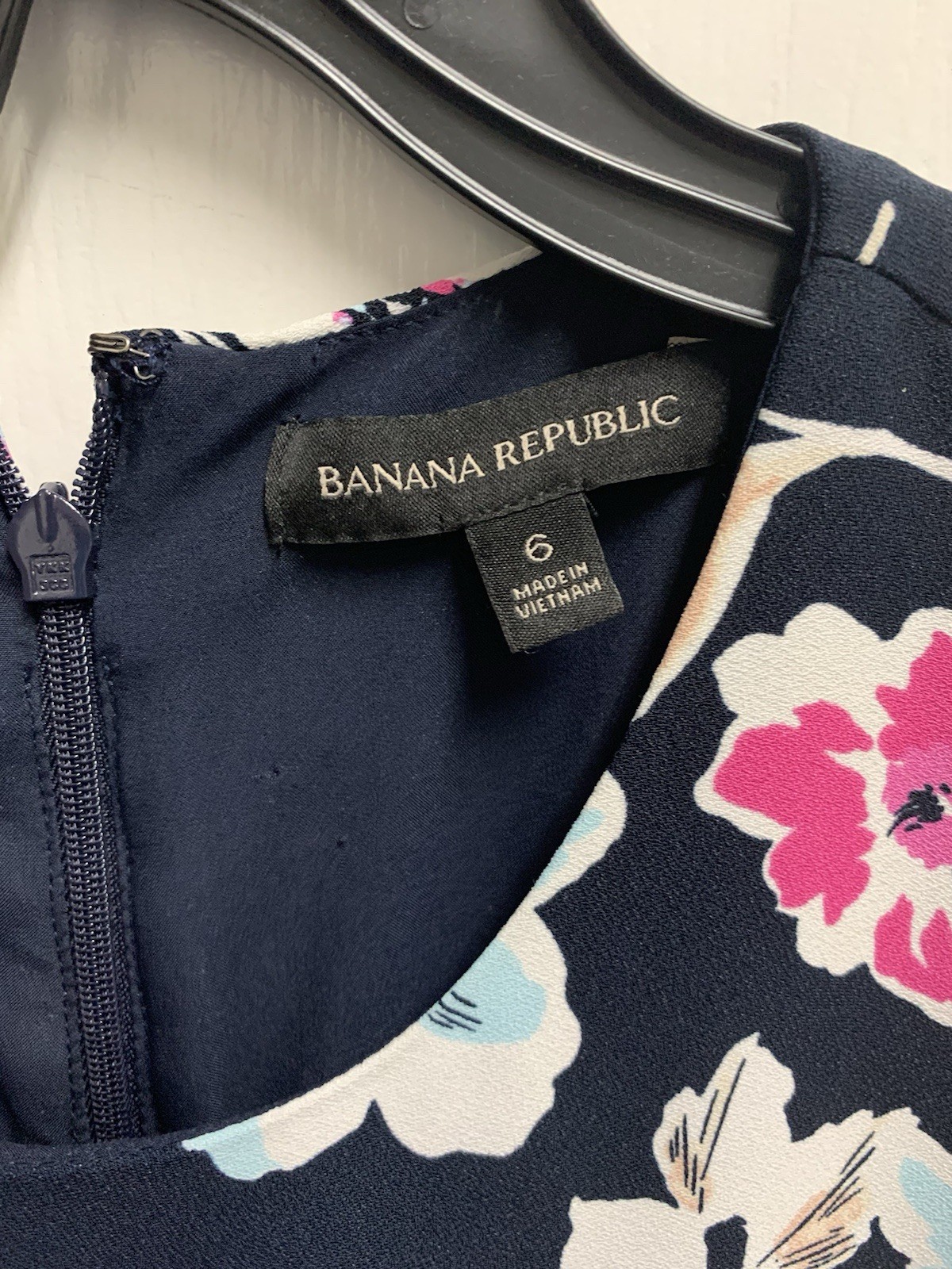 The product is a size 6 Banana Republic floral dress in navy blue. This sleeveless A-line dress is perfect for a party or casual occasion, featuring a knee-length hem and a beautiful floral pattern in a multicolor design. The dress embodies a feminine and breezy style that is ideal for women looking for a stylish and versatile piece to add to their wardrobe.