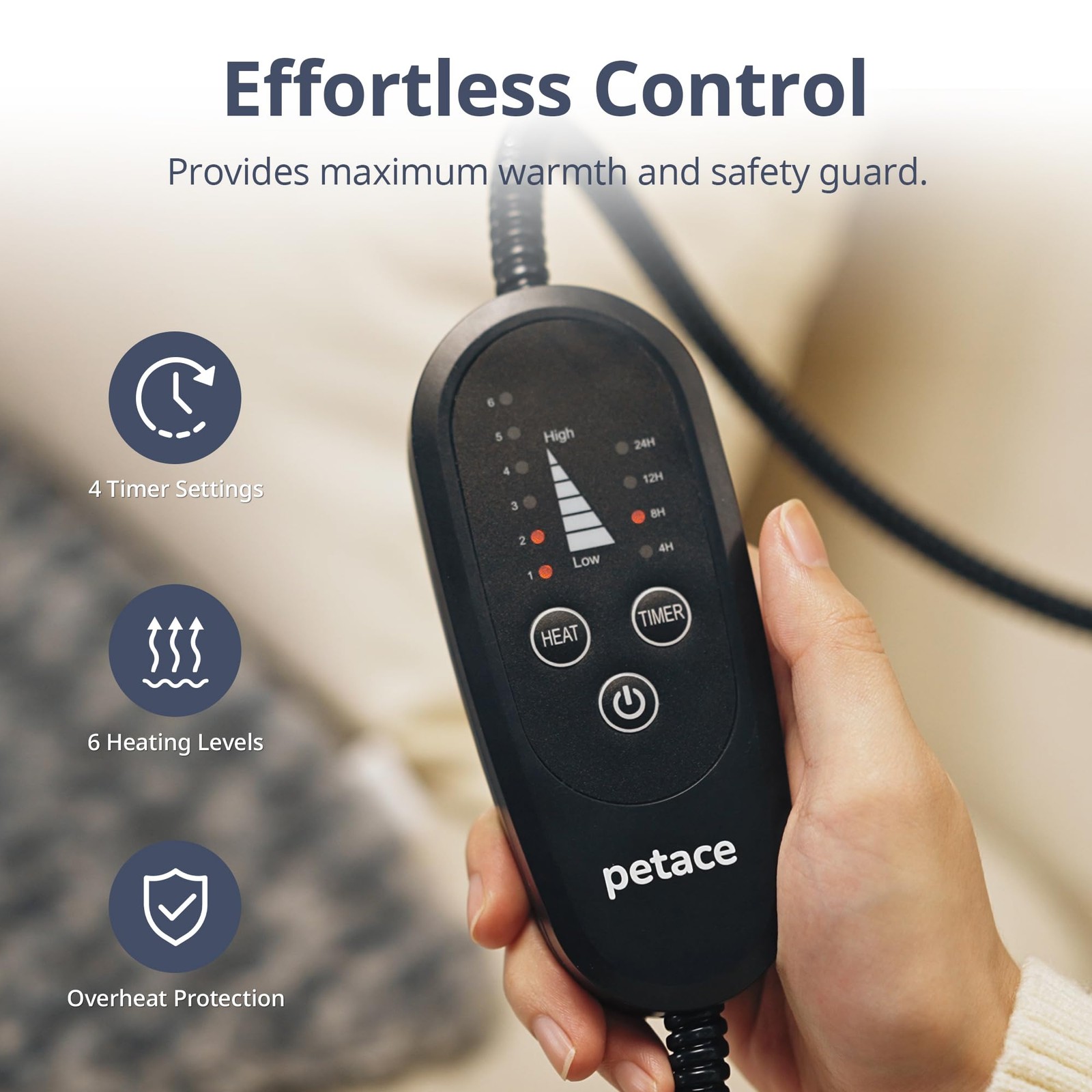 Adjustable Temperature Heated Cat Bed & Dog Heating Pad with Timer, Chew-Resistant Cord, Thick and Soft Cover, Indoor Pet Heating Pad, Diameter 11.8" Hassle-Free Control: Set temp from 6 heat levels (approx 86°F - 131°F) and auto-off function for safety via 4 timer options Pet Friendly Design: 7ft chew-resistant cord to prevent pets from chewing wires; waterproof PVC liner handles spills or messes easily Soft Rosebud Fabric Surface: Upgraded smooth and durable rosebud cover provides cozy warmth for pets and complements home decoration Fire-Retardant Construction: Built in a 7-layer protective structure, flame-resistant cotton and sealed tech for safety; MET Certified for peace of mind Multi-Size Available: Extra Small Size (diameter 11.8") perfect for small animals weighing around 6 lb, e.g., rabbits and kittens