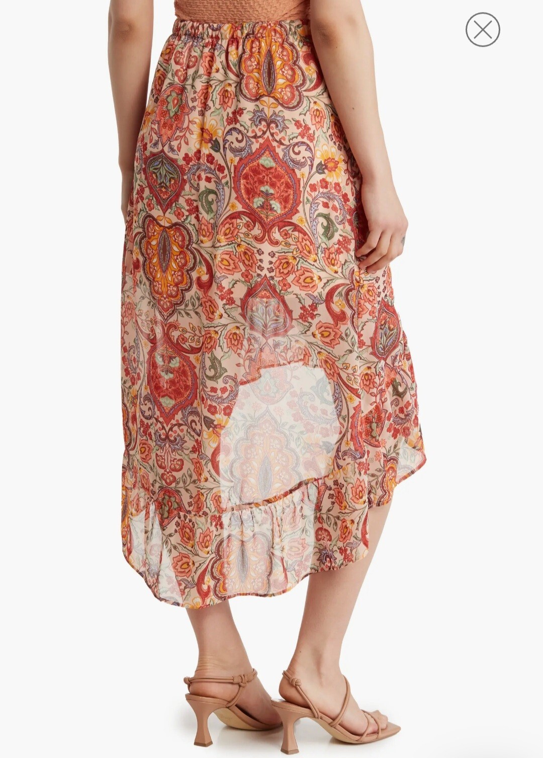 New Status By Chenault Rust Boho Floral Print Chiffon Ruffle High Low Midi Skirt Large L. Elastic Back Waist, Lined , Lightweight, All Seasons , Pull-on. Length Back 36 in Front 22 in , Waist 32 in . Same Day Shipping/ Next Day
