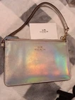 The new Coach Wristlet Wallet in iridescent silver is a stylish and practical accessory for women. Made of sleek leather, this wallet features a zip closure and comes with a convenient wristlet strap for on-the-go use. With its elegant design and brand prestige, this Coach wallet is a must-have item for those looking to elevate their everyday essentials.