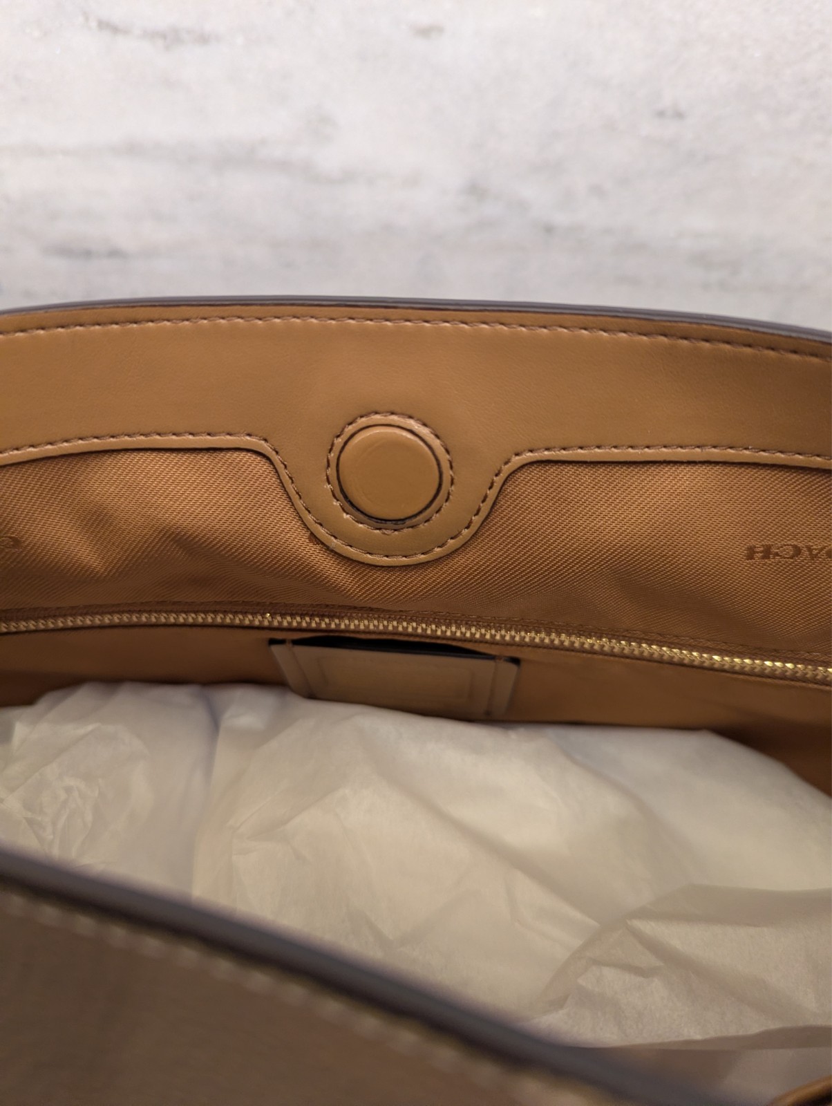 New Coach 100% AUTHENTIC leather handbag. Buttery soft leather with a leather covered magnetic closure and 3 inner pockets with an outer zippered pocket. Beautiful beige color to add to your handbag collection and wardrobe.