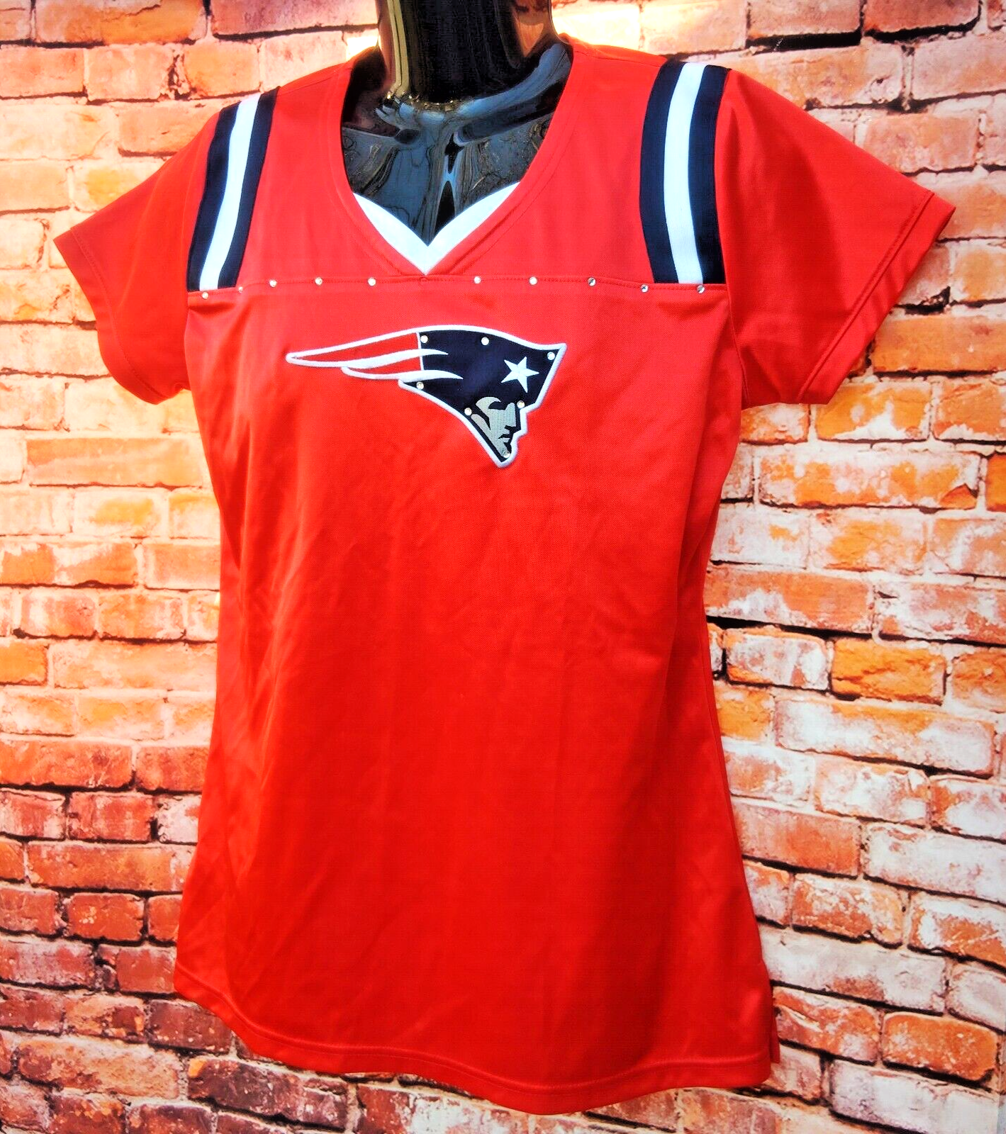 Show your love for the New England Patriots with this officially licensed NFL jersey/shirt. The red shirt features rhinestones that add a touch of sparkle to your outfit. It's perfect for women who want to show their support for the team during regular season games. Made in China, this size L jersey is a must-have for any fan of the National Football League. Whether you're watching the game from home or cheering on the Patriots at the stadium, this shirt is sure to make you stand out. Get your hands on this NFL Team Apparel jersey and show your love for the New England Patriots in style. If you like this item, but don't like the price, please feel free to contact me anytime/and or make an offer. Thank You