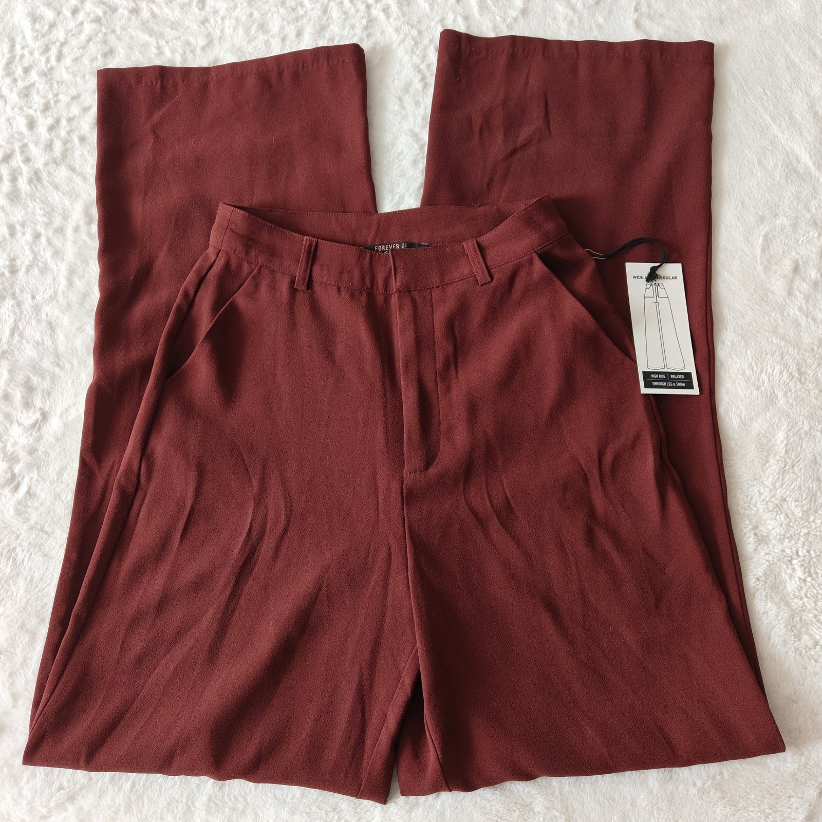• Waist 16 inches around • Rise 12 inches • Inseam 33 inches • Hips 44 inches Forever 21 Contemporary wide leg pants in a rich rust red hue. These high-rise trousers offer a relaxed fit through the leg and thigh, creating a flattering silhouette. Designed with functional pockets and a classic zip fly closure, they are perfect for dressing up or down. Ideal for a casual day out or a chic office ensemble. Style: Dress Pants Material: Polyester Leg Style: Wide-Leg Type: Pants Fabric Type: Polyester Features: Pockets, Wrinkle Resistant, Lightweight Closure: Zip, Button, Pull On Pattern: Solid Occasion: Casual, Workwear Keywords: Forever 21 pants, wide leg, high rise, rust red, contemporary, relaxed fit, trousers, palazzo, flowy, casual, office wear, smart casual, tailored, minimalist Please feel free to message me with any questions! I am open to offers.